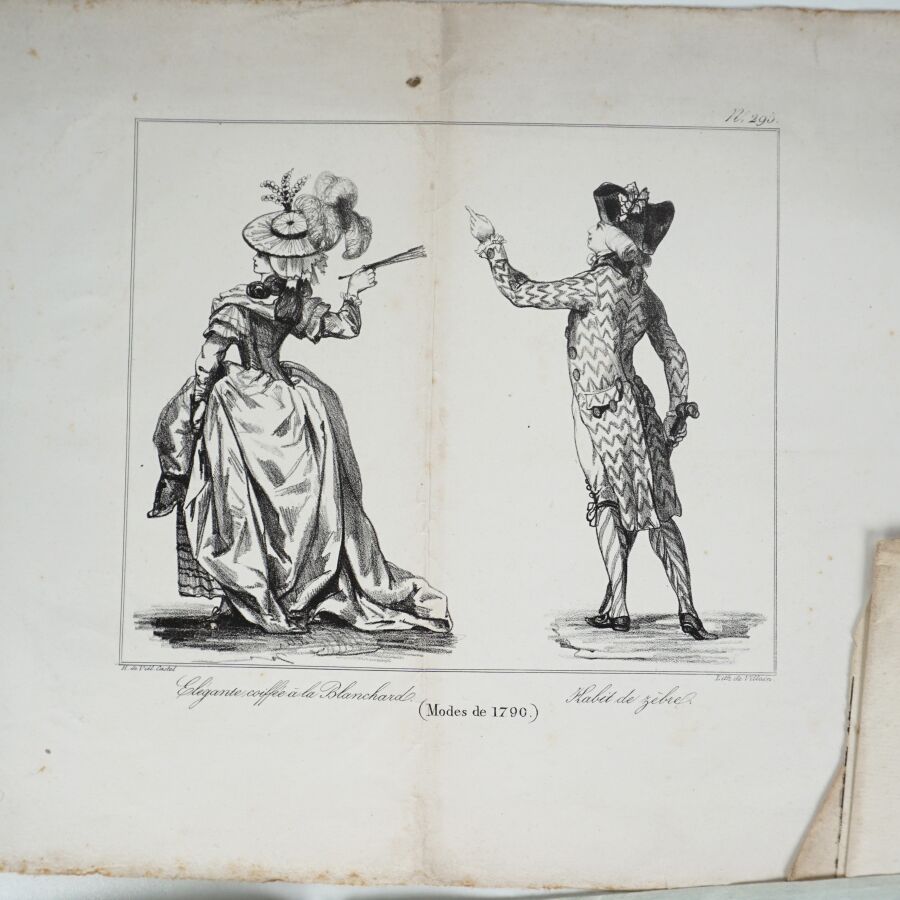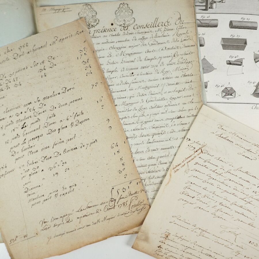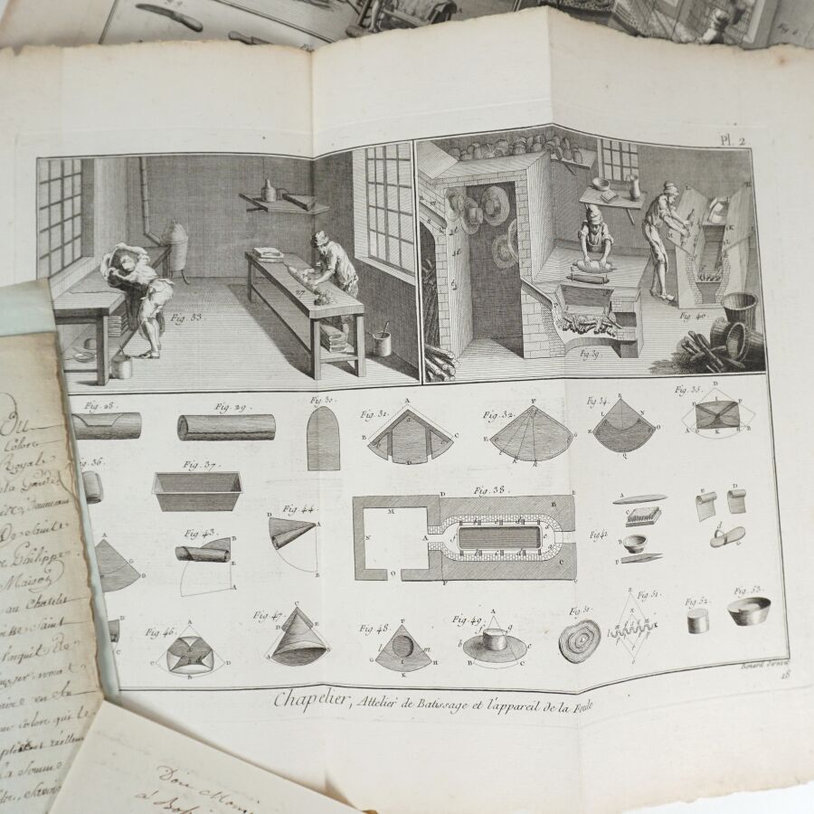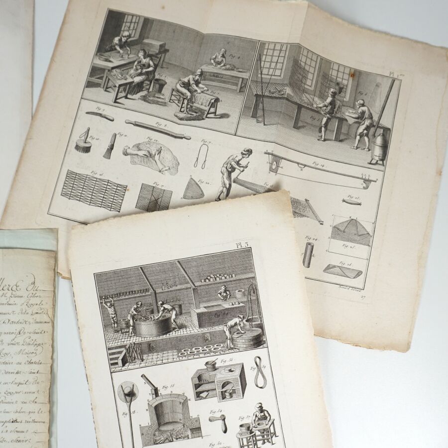Lot. Ensemble de documents dont divers manuscrits XVIIIe siècle (dont une reconnaissance de dettes d'un tapissier), 3 planches de l'Encyclopédie (chapellerie) et une gravure de modes post.