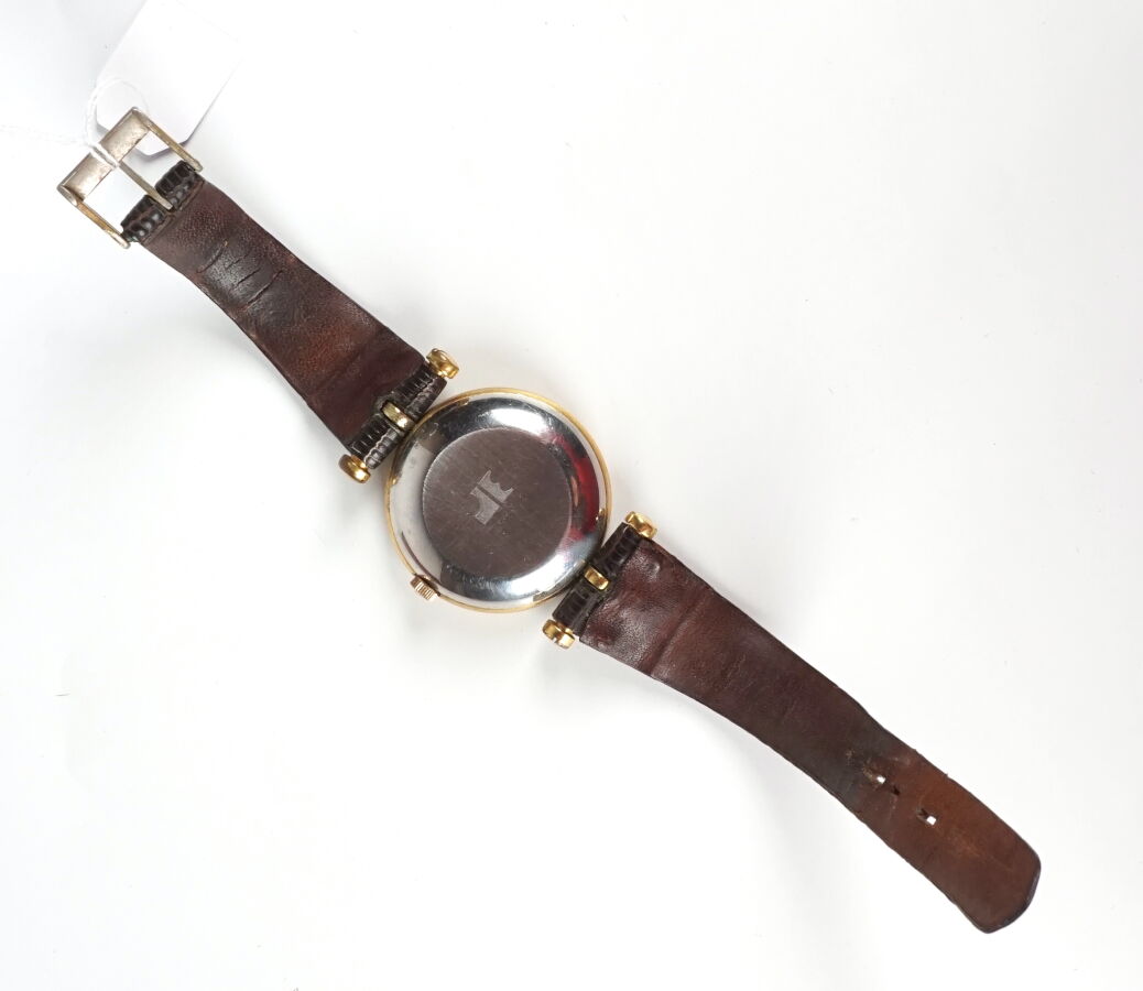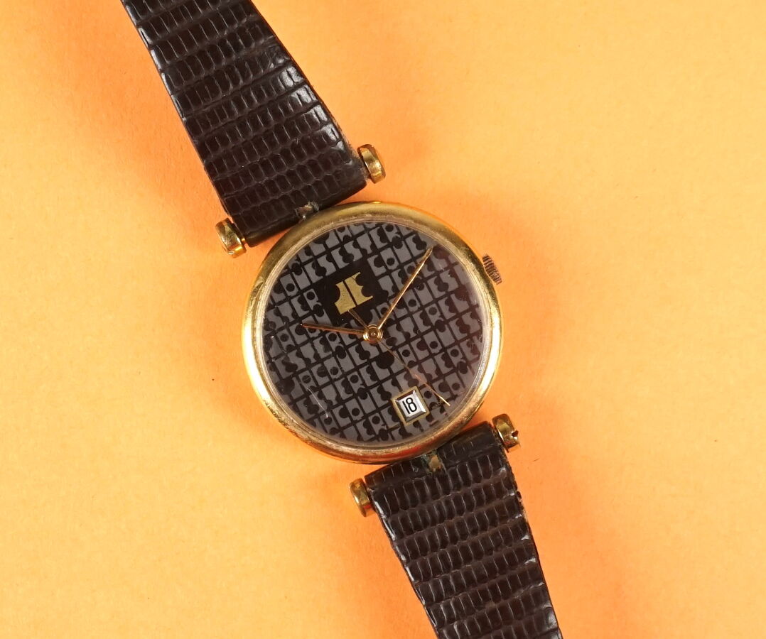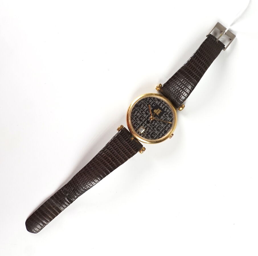 LOT Jacques ESTEREL : Montre, boitier en métal doré 32 mm, cadran muet monogrammé "JE" sur fond brun, dateur à 6h, fond numéroté 6315.1, bracelet cuir brun lézard, boucle ardillon.
