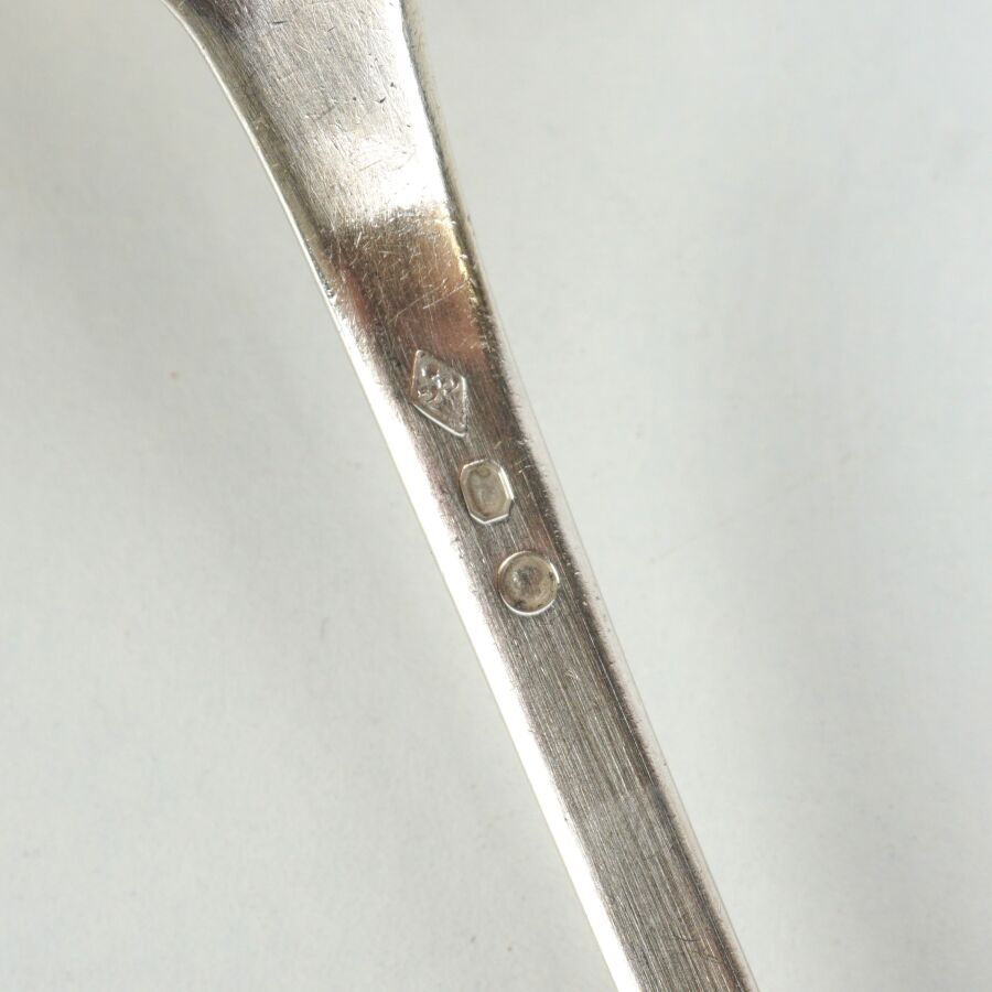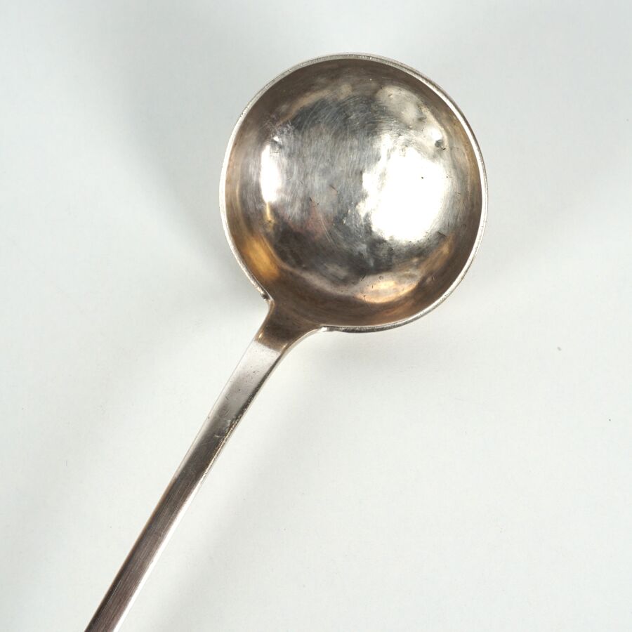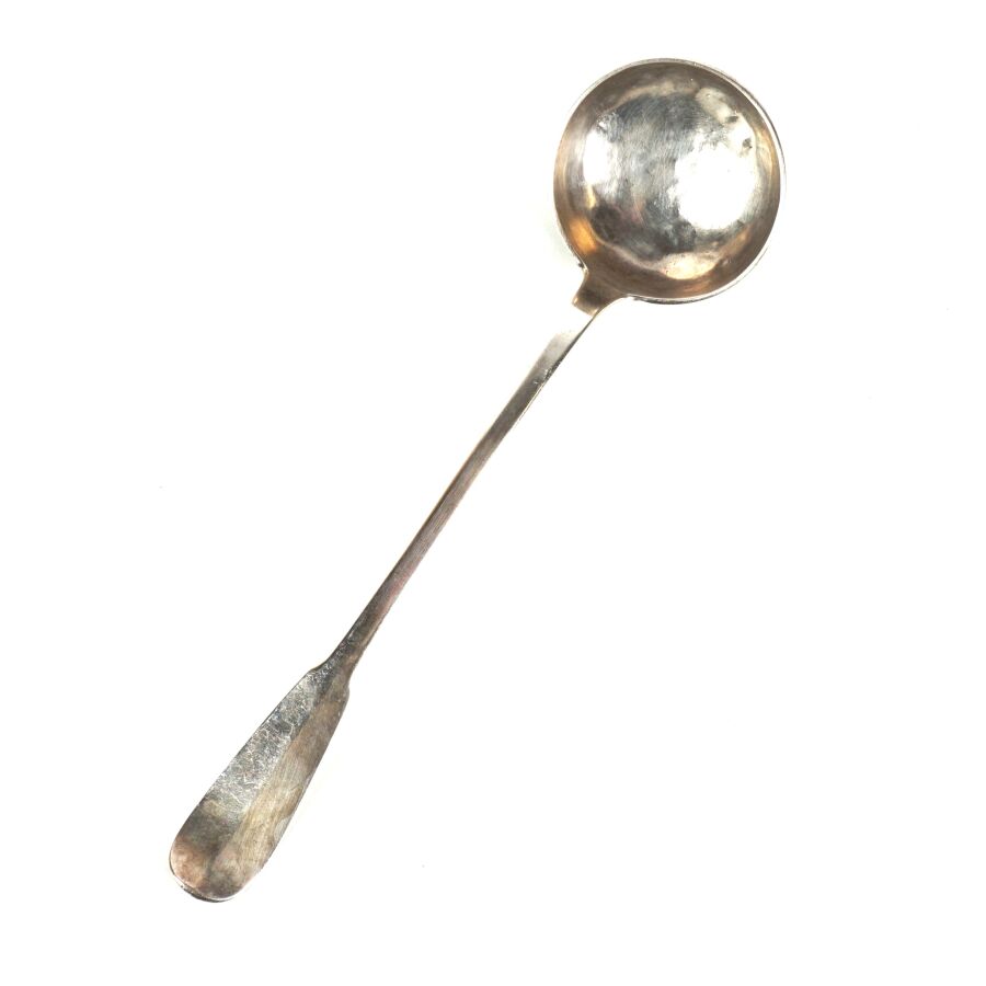 Louche en argent, poinçon 2ème coq 1er titre, grosse garantie Paris, décor uniplat, manche chiffré "DA", L. 34.1 cm. Poids brut : 213 g environ.