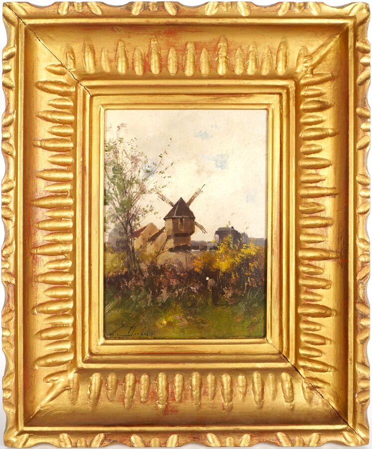 Louis DUPUY (Eugène GALIEN-LALOUE (1854-1941), "Le moulin à vent", huile sur panneau signée en bas à gauche, 21.5 x 15 cm (tâche, légers manques).