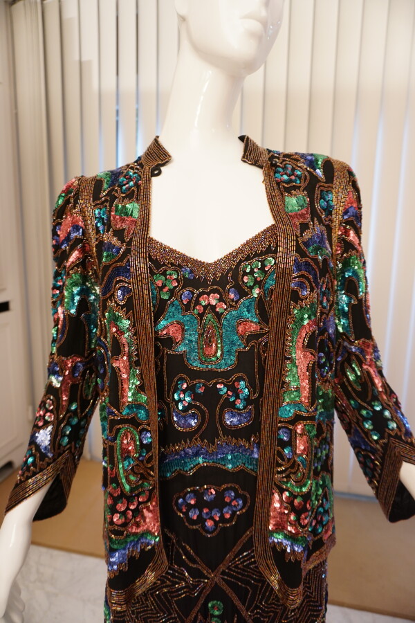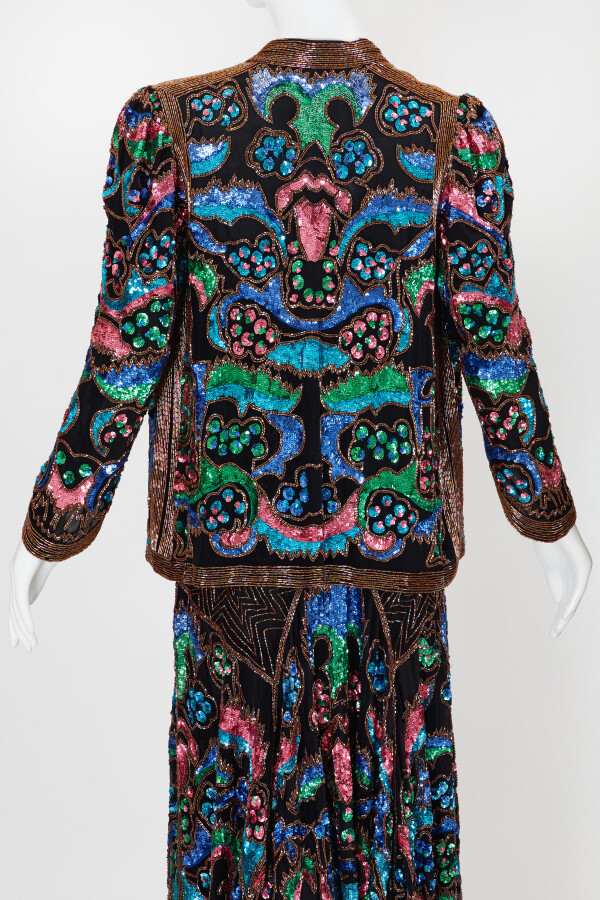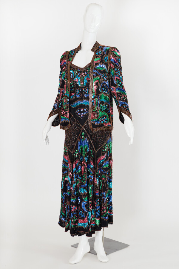 Ensemble en crêpe georgette composé d'une robe à fines bretelles, boutonnée dans le dos, et d'une veste ouverte, l'ensemble entièrement brodé de motifs géométriques multicolores en paillettes et tubes.