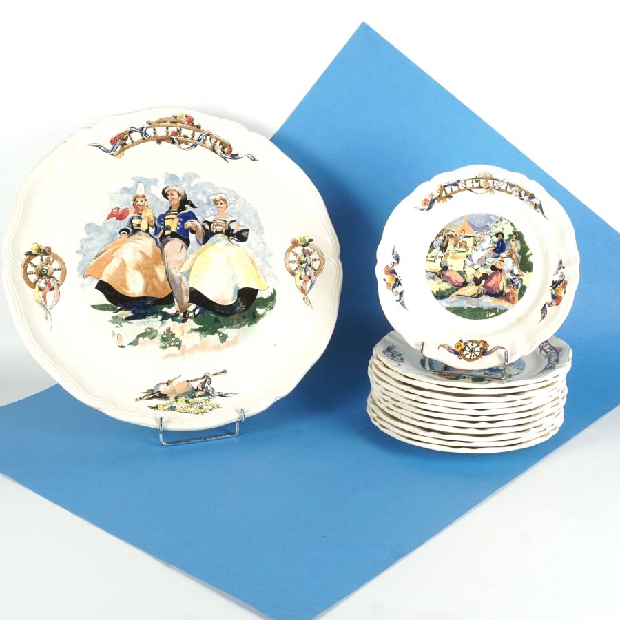 Louis GARIN (1888-1959), Service à dessert "Celtique", composé de douze assiettes et un plat en faïence émaillée polychrome à décor de scènes bretonnes dans le bassin, marqué au dos "Celtique, Louis Garin, S.D.V France", D. 19.1 cm et 33.8 cm.