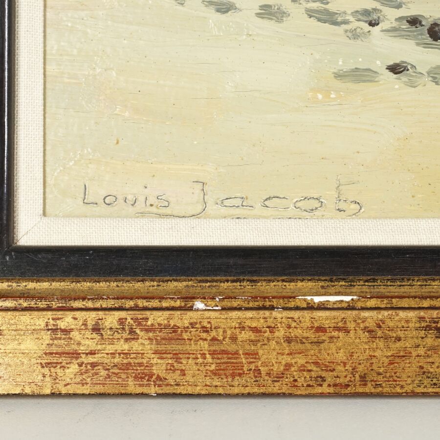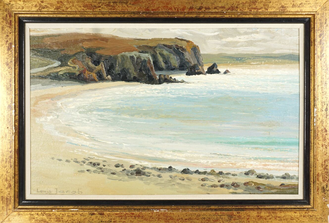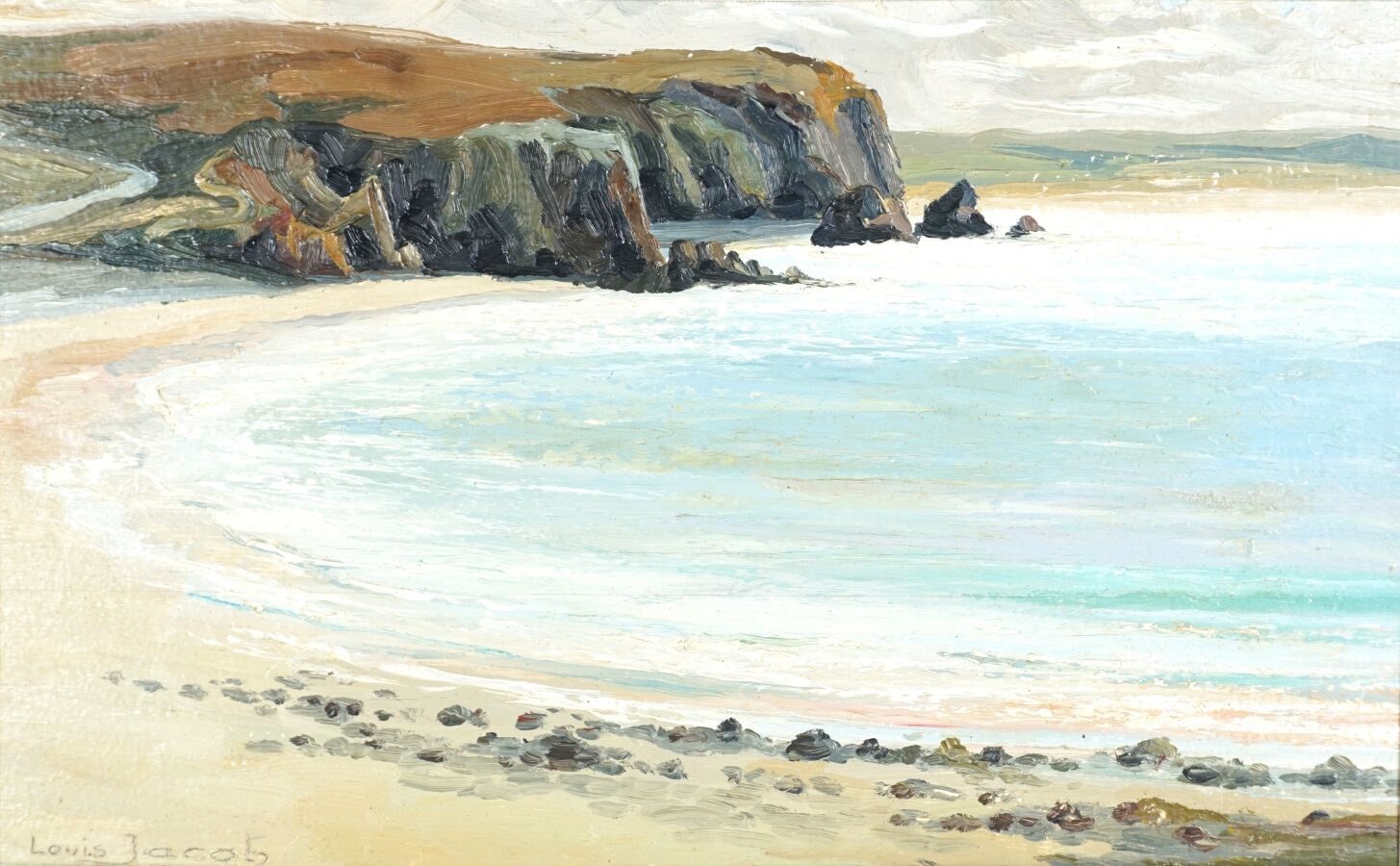 Louis JACOB (XXe), "Anse de Dinan à Crozon", huile sur contreplaqué, signée en bas à gauche, située au dos, 29.5 x 46 cm.