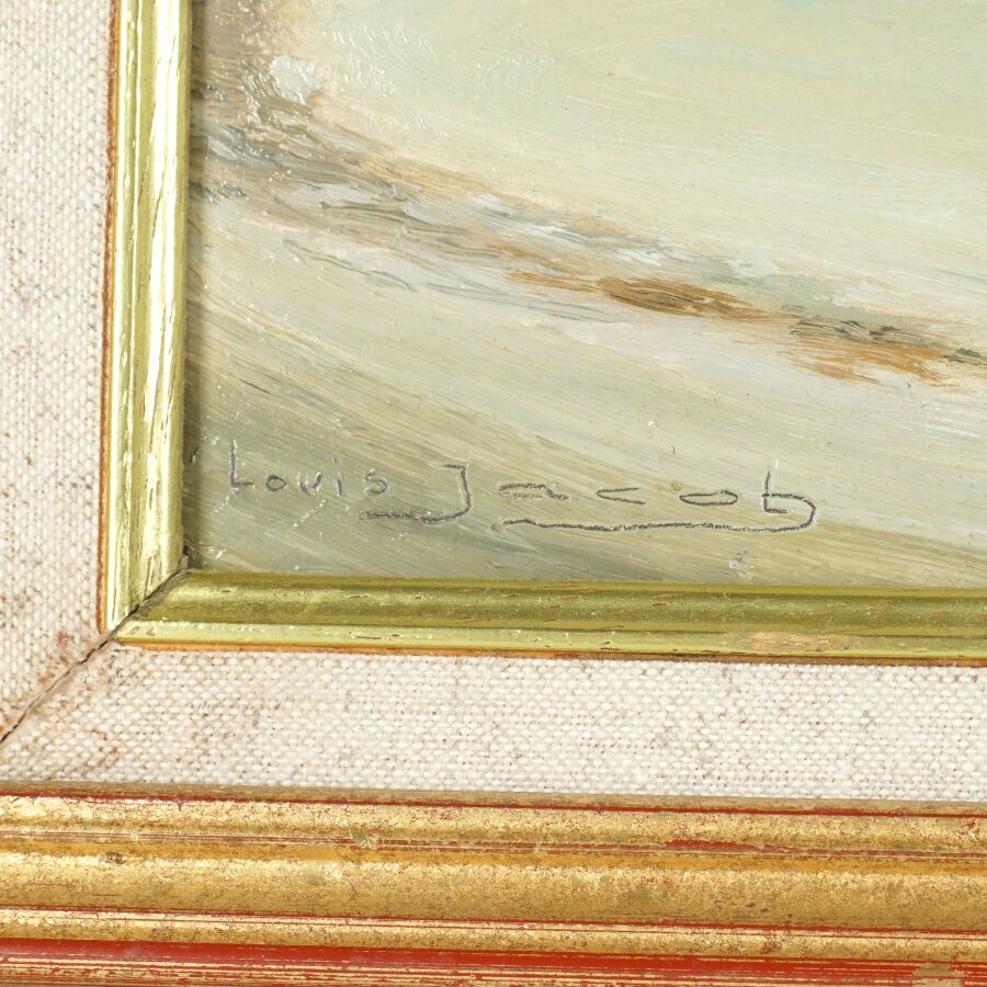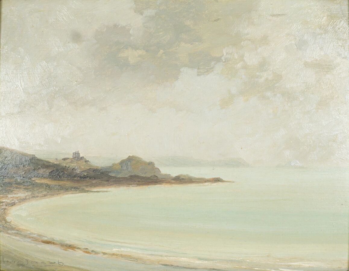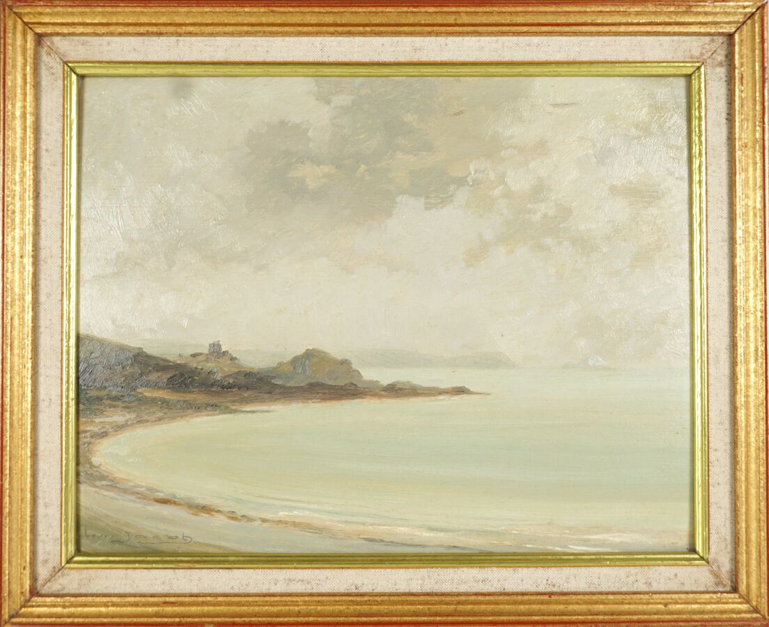 Louis JACOB (XXe), "Bord de mer à Erquy", huile sur isorel, signée en bas à gauche, située au dos, 27.5 x 35 cm.