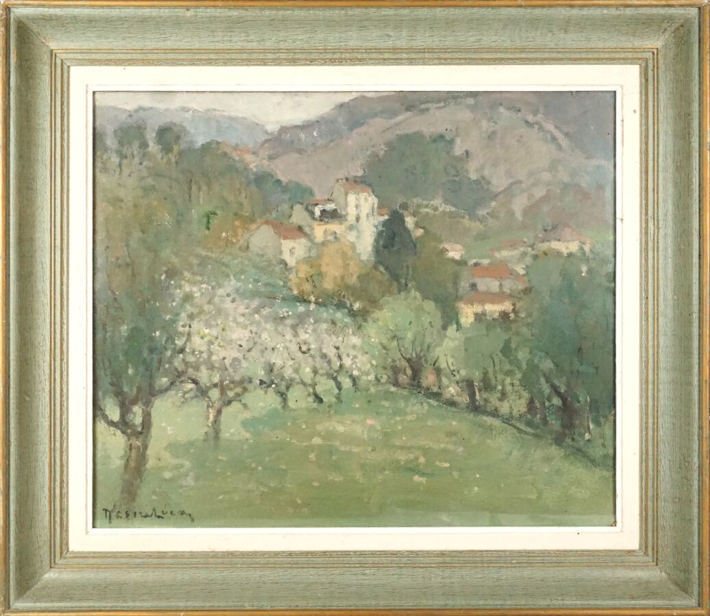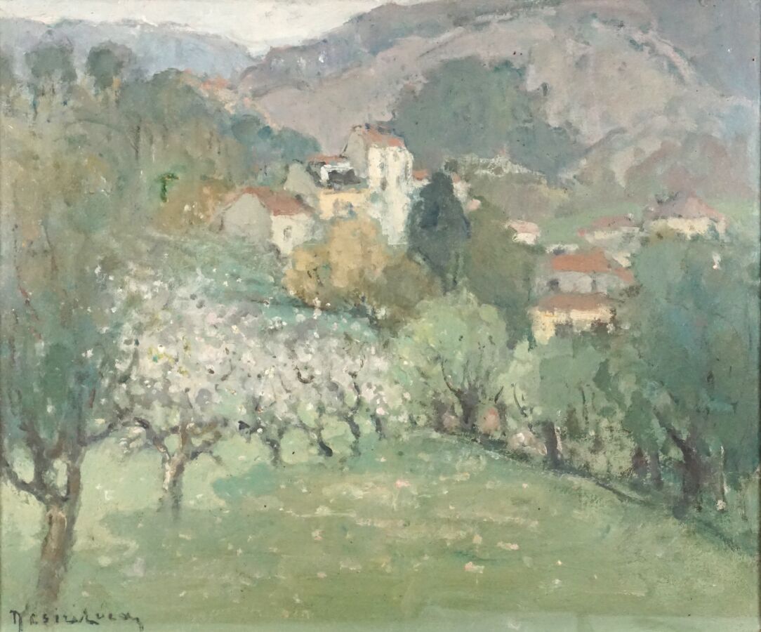 Louis Marie DESIRE-LUCAS (1869-1949), "Le Printemps à Contes, Alpes Maritimes", huile sur toile signée en bas à gauche, contresignée et située au dos, 46 x 54.5 cm (petit accroc en haut à droite).