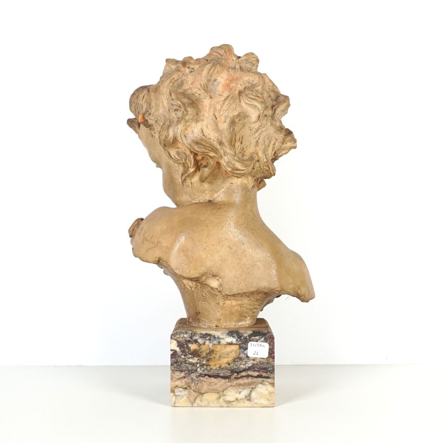 Louis MAUBERT (1875-1949), "Buste d'enfant", sculpture en terre cuite, signée en creux à l'arrière, présentée sur un socle quadrangulaire en marbre bordeaux veiné blanc, H. Totale : 39 cm (petits éclats).