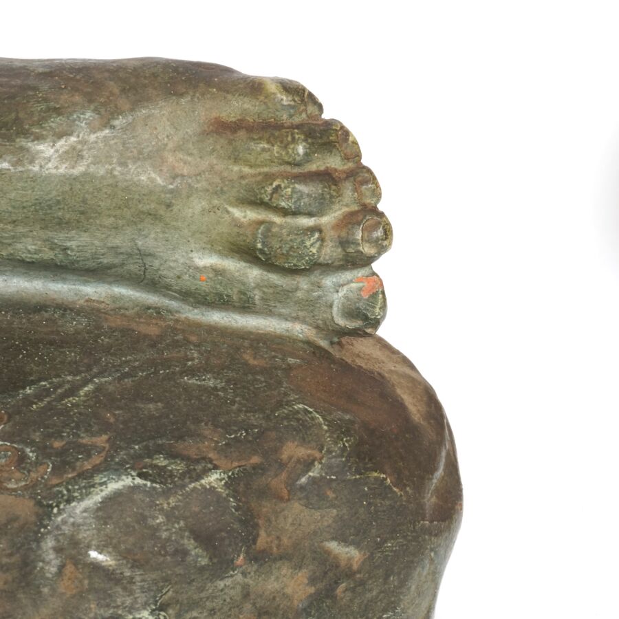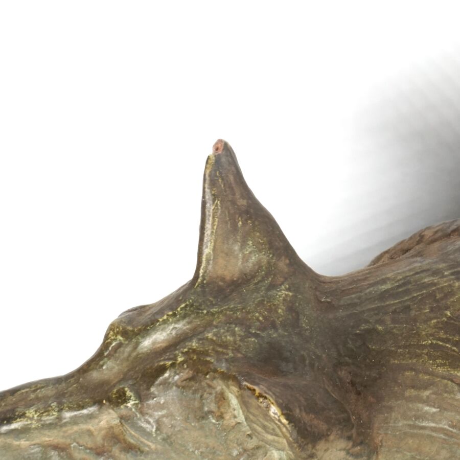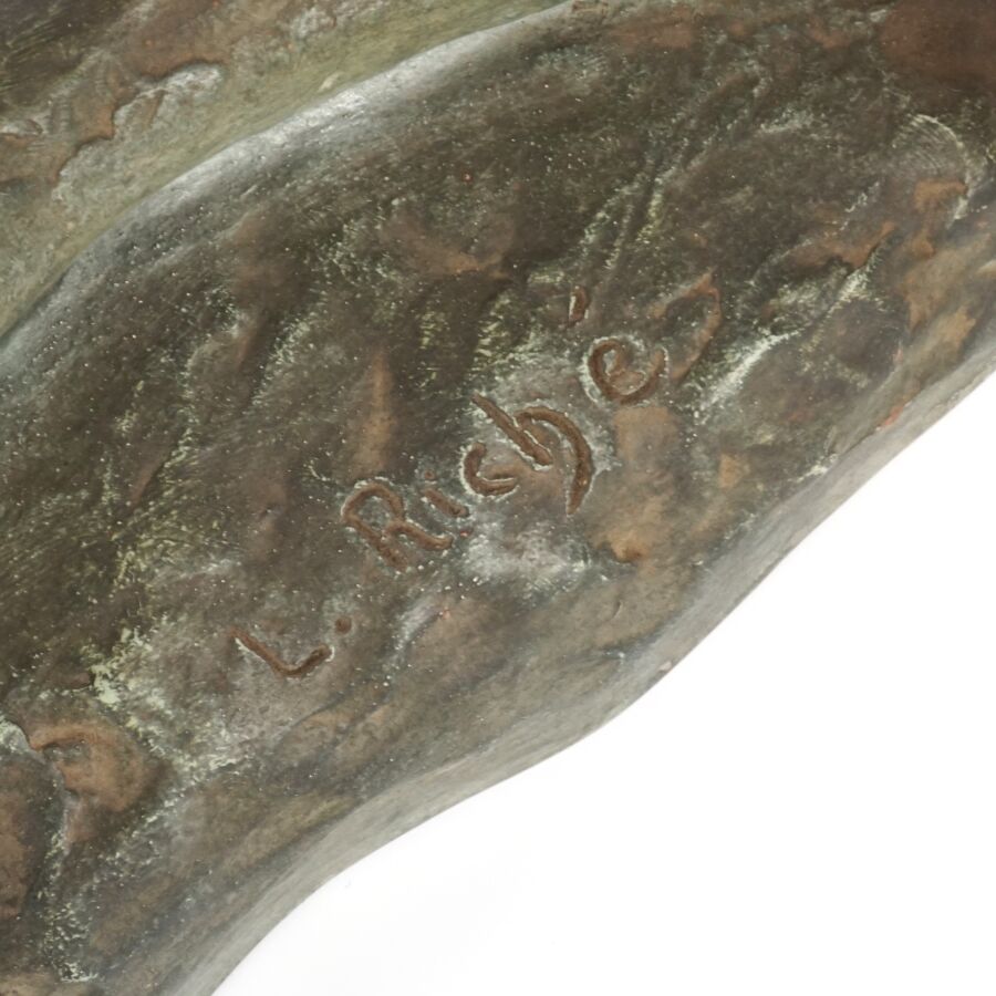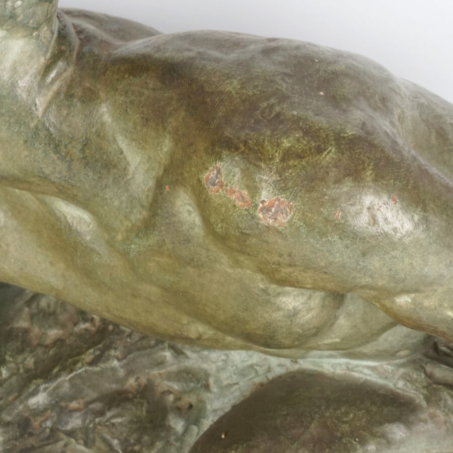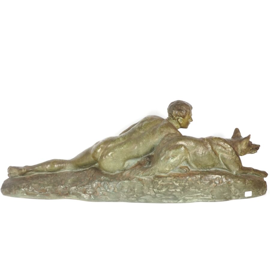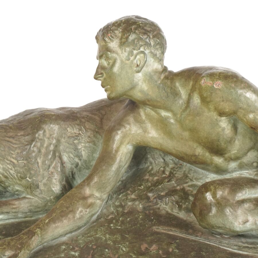Louis RICHE (1877-1949), "Chasseur et son chien - loup", groupe en terre cuite patinée vert à l'imitation du bronze, signé en creux sur la terrasse, H. 30 cm x 88 cm (très légers éclats).