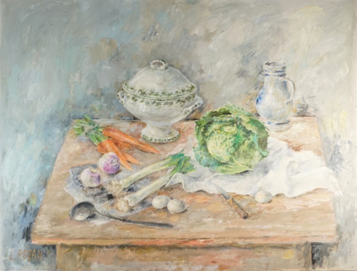 Louis ROSAN (1926-2017), "Nature morte au chou", huile sur toile signée en bas à droite, 90 x 116 cm.