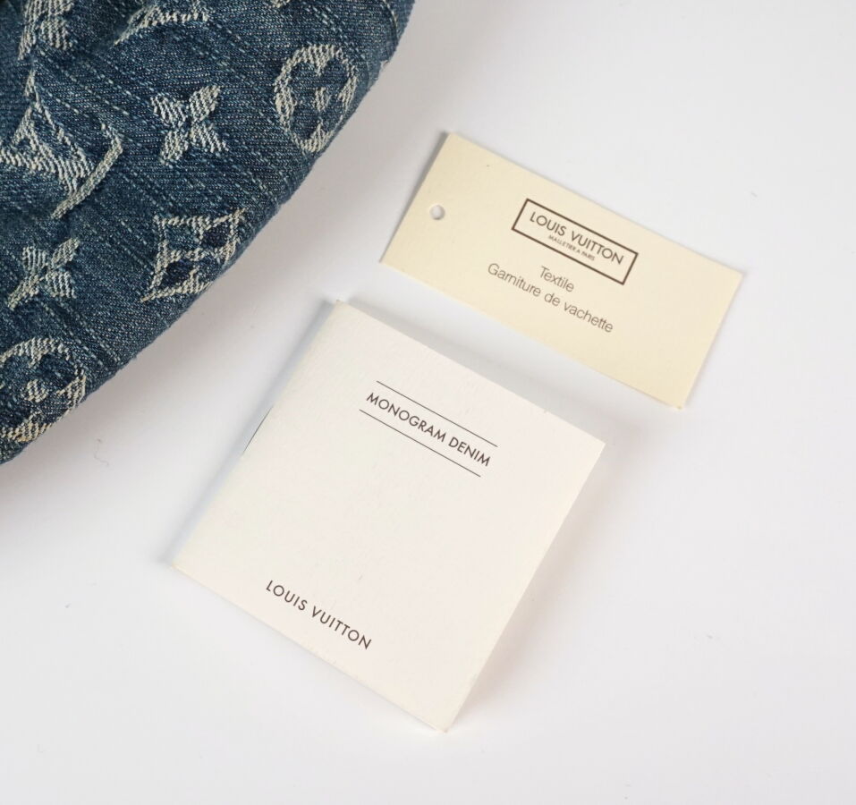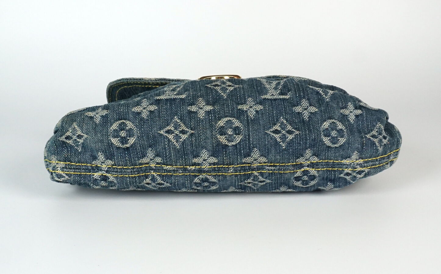 Louis VUITTON : Petit sac "Pleaty" en toile denim Monogram et cuir naturel, fermoir en métal doré sur rabat, petite anse à une attache mousqueton, doublure en daim tournesol, signé et numéroté CA0093, L. 27 cm, H. 12 cm (très légères usures d'usage, bon état général).