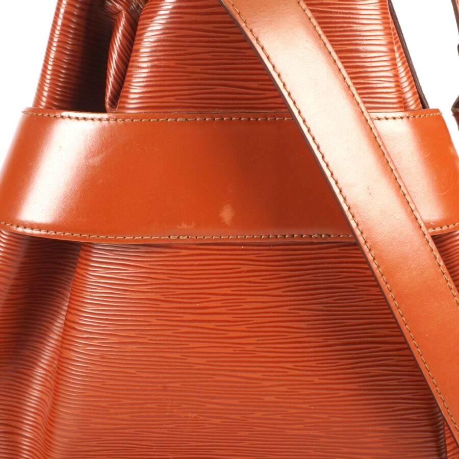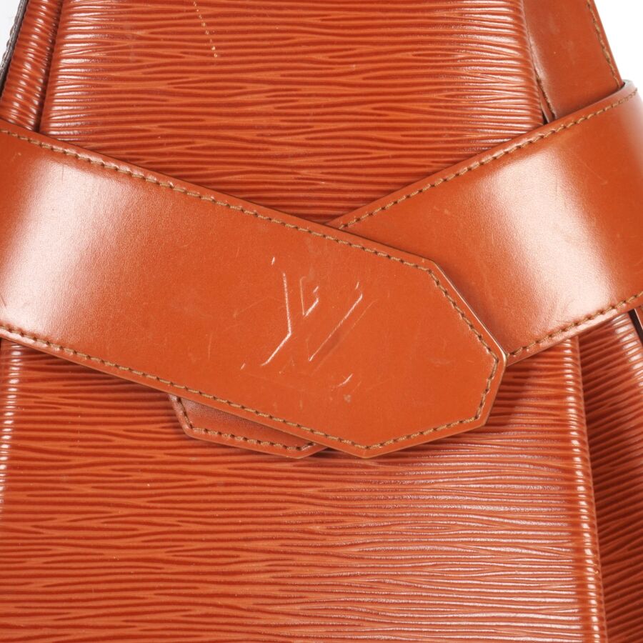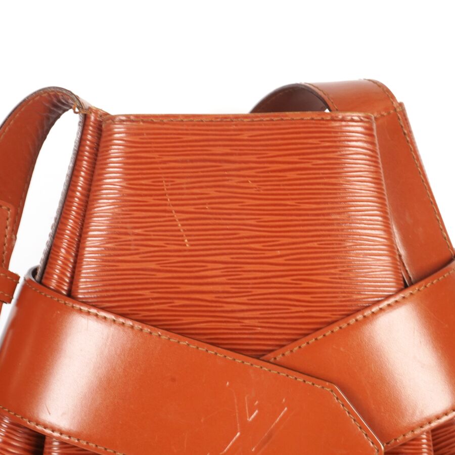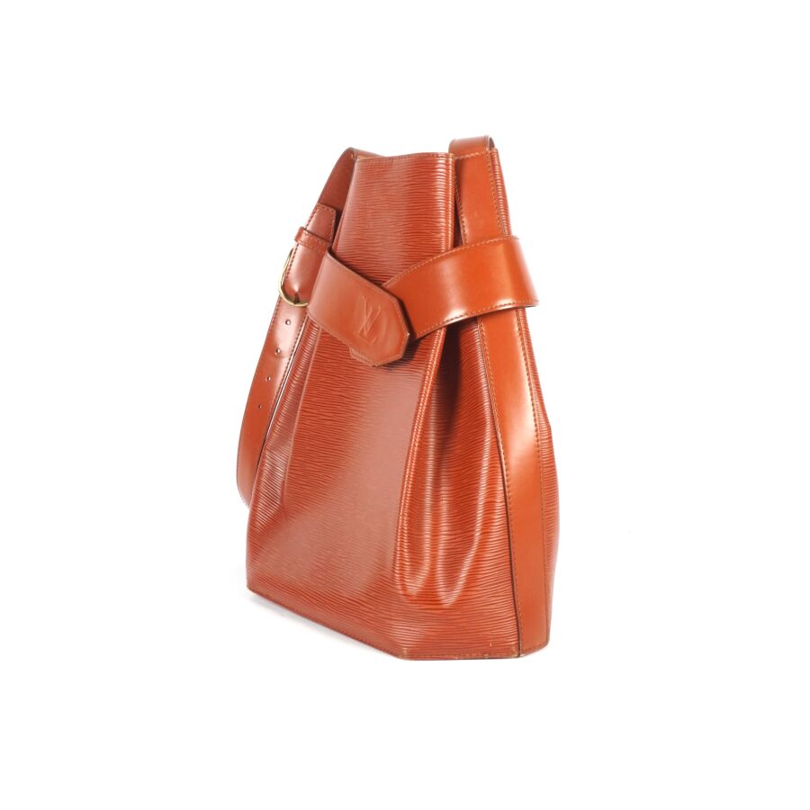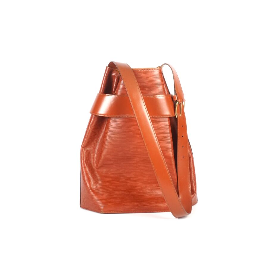 LOUIS VUITTON : Sac seau modèle "Twist Bucket" en cuir épi et lisse couleur cognac, fermeture en partie haute par deux sangles dont une logotée "LV" et un bouton pression, intérieur en suède marron, bandoulière en cuir ajustable pour porté épaule, avec sa pochette intérieure amovible en cuir épi, fermeture zippée, reliée au sac par une accroche, Dim. 35 x 30 x 15 cm (petites usures et griffures au cuir).