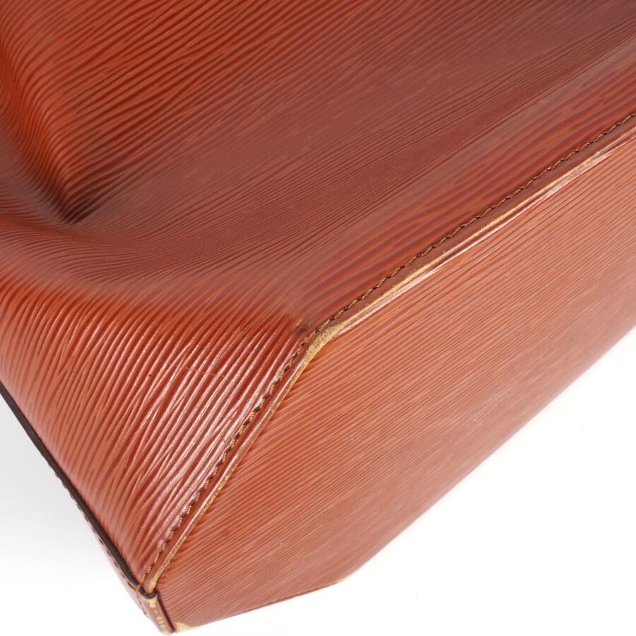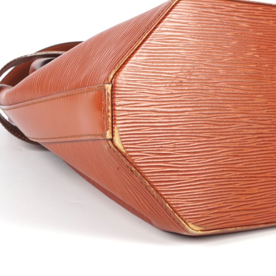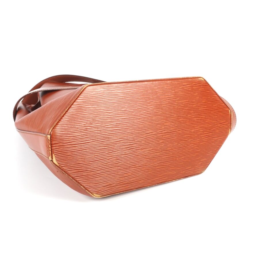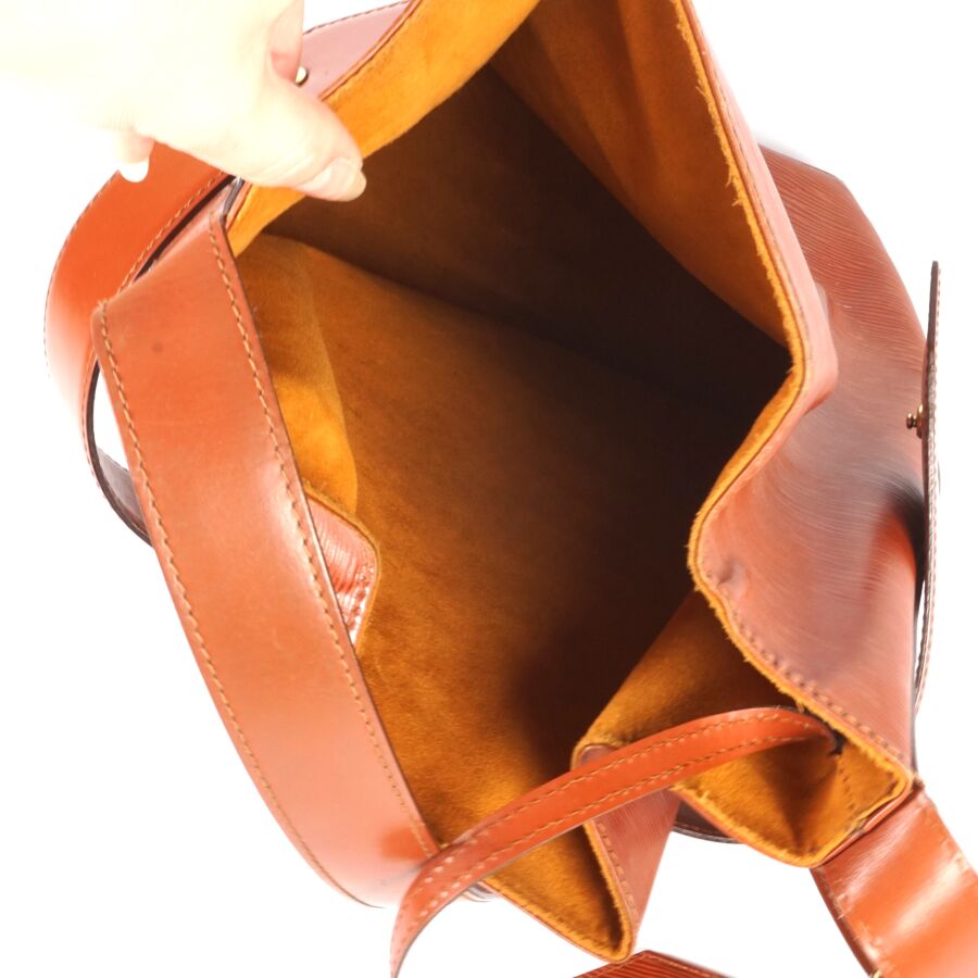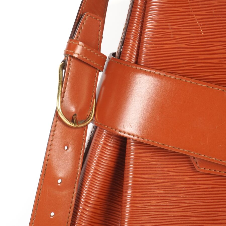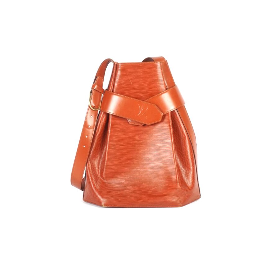 LOUIS VUITTON : Sac seau modèle "Twist Bucket" en cuir épi et lisse couleur cognac, fermeture en partie haute par deux sangles dont une logotée "LV" et un bouton pression, intérieur en suède marron, bandoulière en cuir ajustable pour porté épaule, avec sa pochette intérieure amovible en cuir épi, fermeture zippée, reliée au sac par une accroche, Dim. 35 x 30 x 15 cm (petites usures et griffures au cuir).