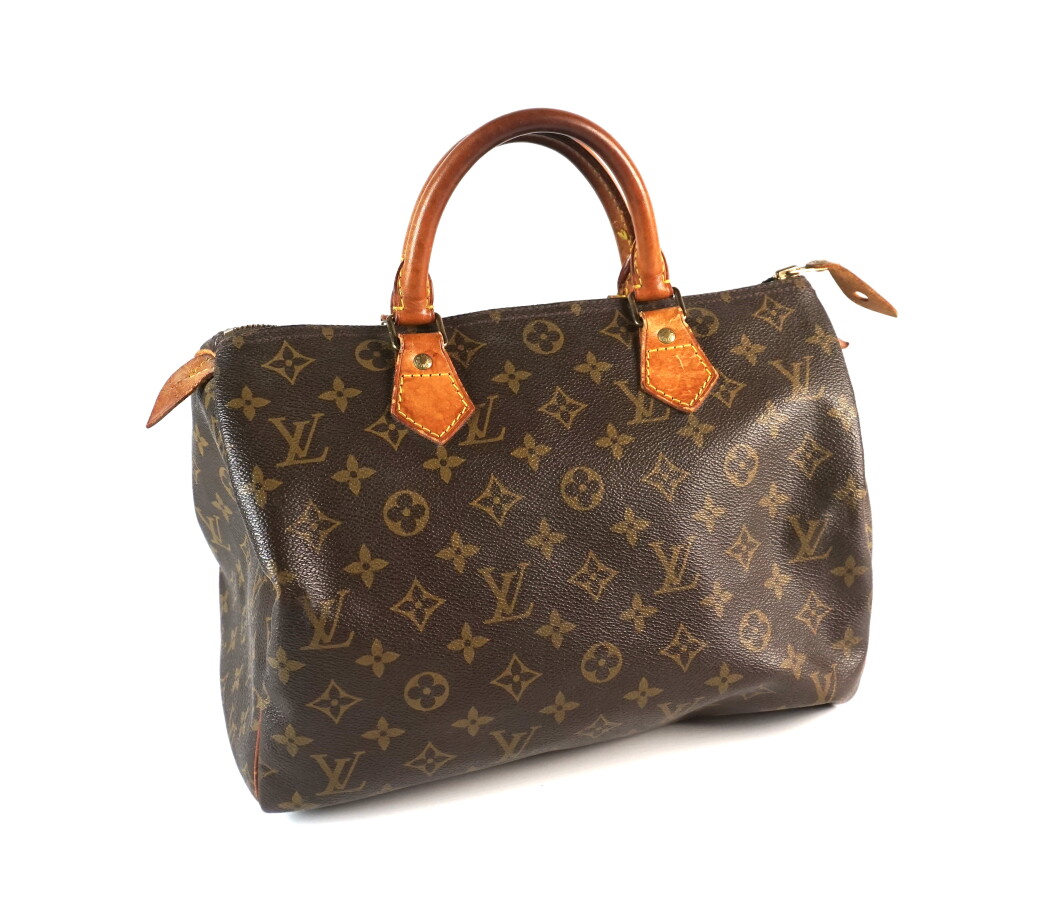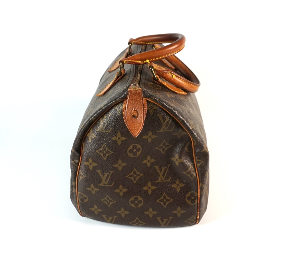 LOUIS VUITTON : Sac "Speedy", toile "Monogram", cuir naturel et métal doré, fermeture zippée, doublure en toile marron, numéroté à l'intérieur "VI 0970", L. 30 cm, H. 22 cm (Bon état général, belle patine du cuir légèrement usé, une tache à l'intérieur).