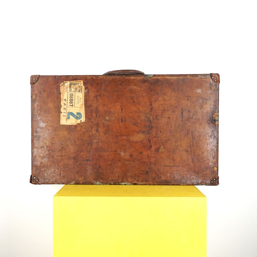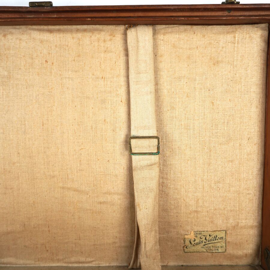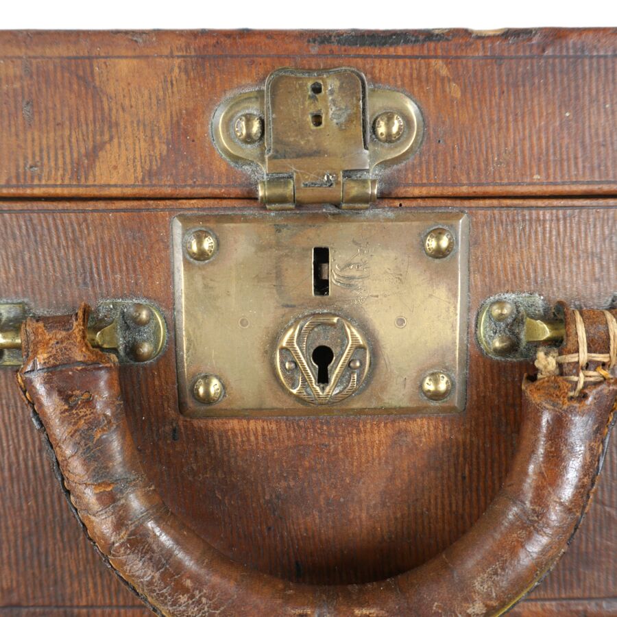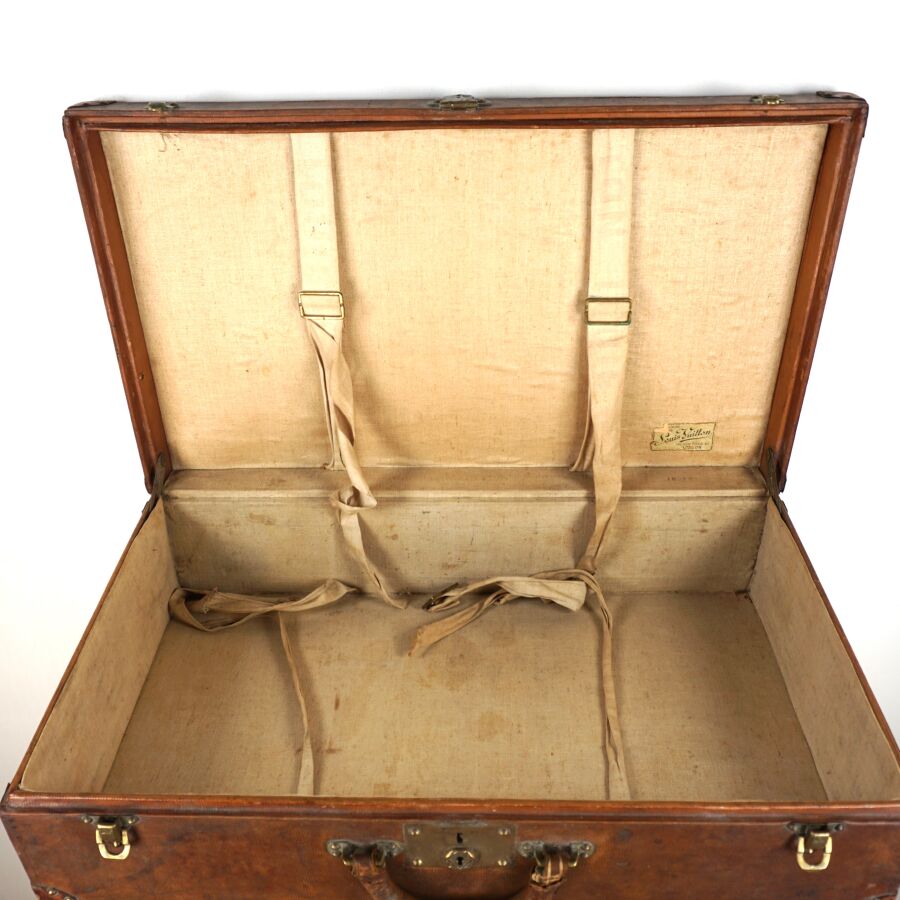 LOUIS VUITTON : Valise, âme en bois, gainée de cuir épi brun-cognac, une anse supérieure en cuir brun pour un porté main, fermetures en métal doré monogrammé et clous, intérieur en tissu beige avec sangles d'origine logotées, étiquette signée et numérotée 180888(?) au tampon à l'intérieur, étiquettes sur l'extérieur, Dim. Hors anse : 65.5 x 39 x 17.5 cm (usures, déchirures, fermeture centrale non fonctionnelle).