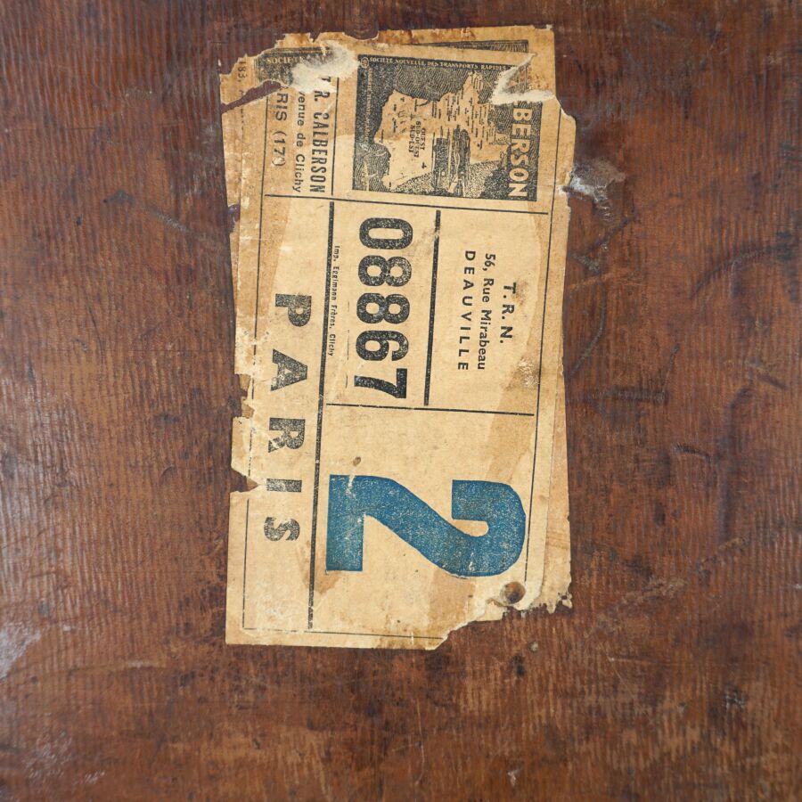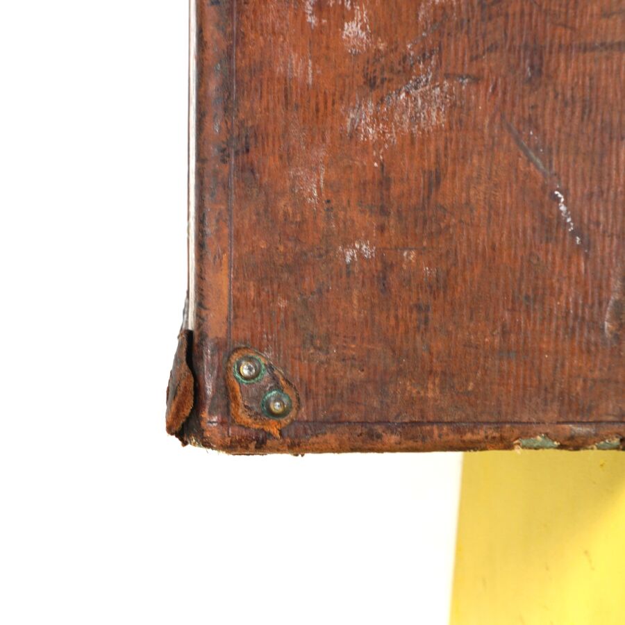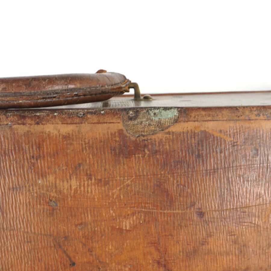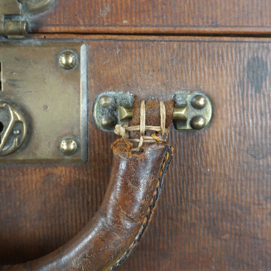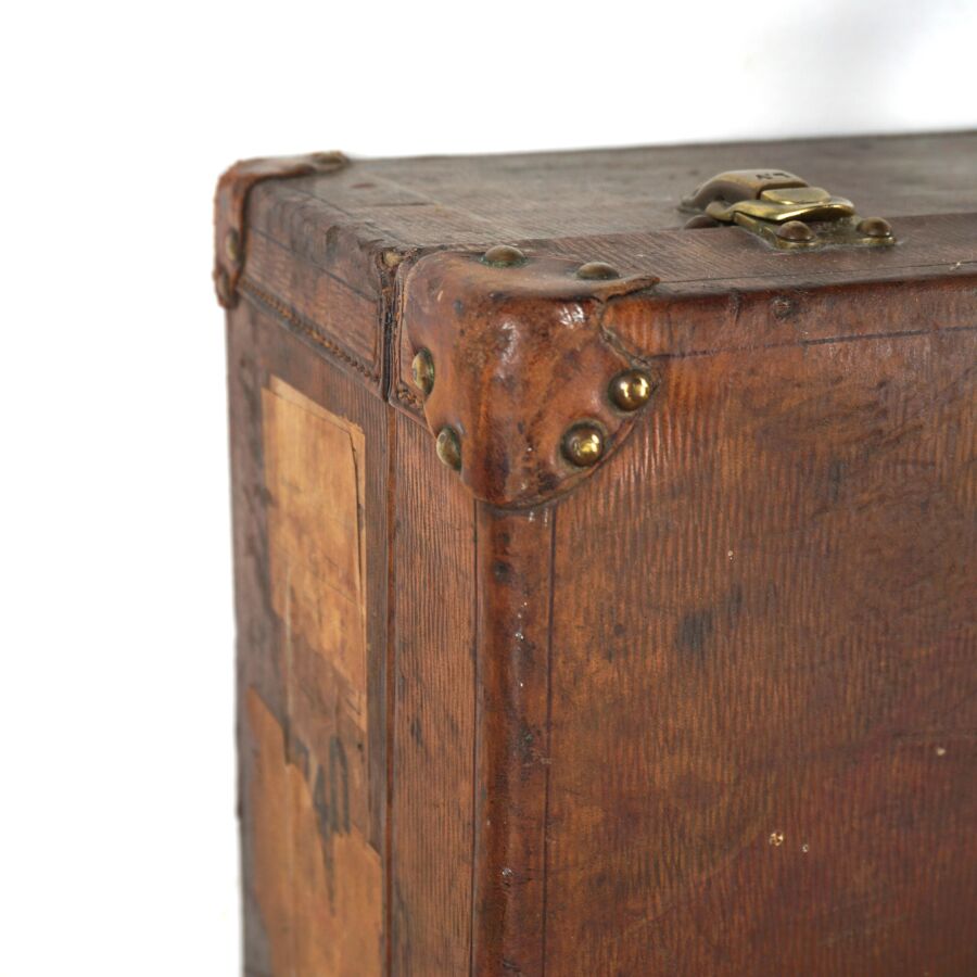 LOUIS VUITTON : Valise, âme en bois, gainée de cuir épi brun-cognac, une anse supérieure en cuir brun pour un porté main, fermetures en métal doré monogrammé et clous, intérieur en tissu beige avec sangles d'origine logotées, étiquette signée et numérotée 180888(?) au tampon à l'intérieur, étiquettes sur l'extérieur, Dim. Hors anse : 65.5 x 39 x 17.5 cm (usures, déchirures, fermeture centrale non fonctionnelle).