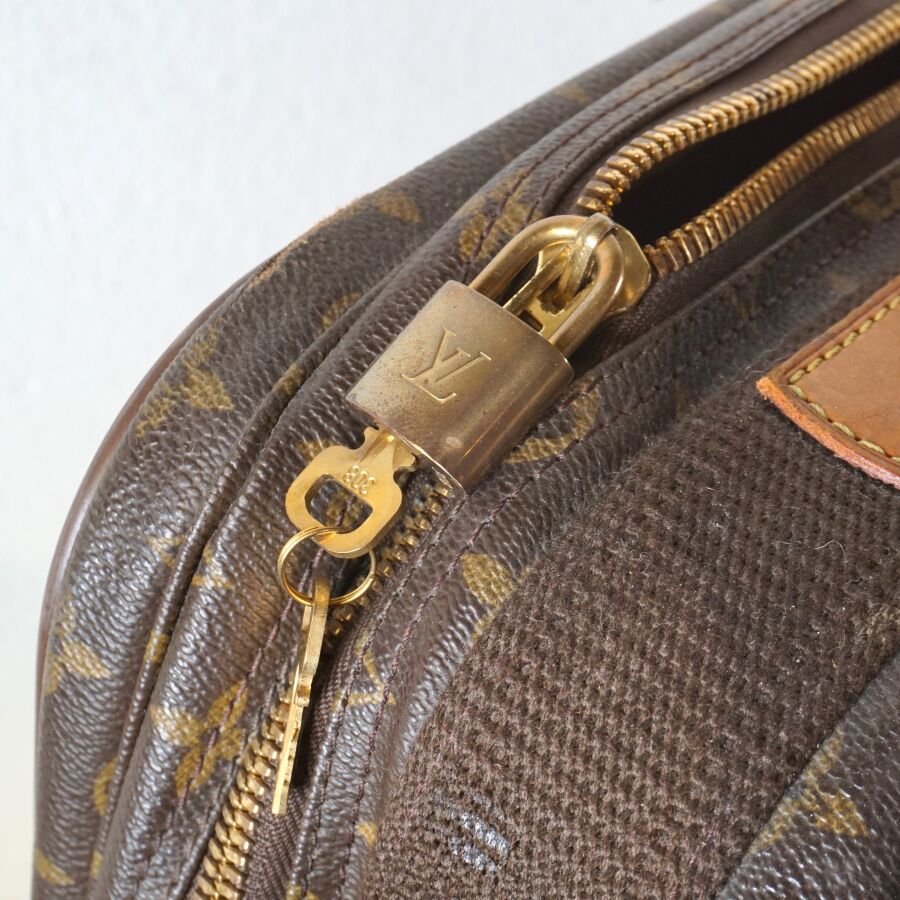 Louis VUITTON : Valise souple modèle "Satellite" en toile Monogram et cuir cognac, intérieur en tissu beige avec deux sangles fermant par deux crochets en métal doré dont un siglé, une anse en cuir, fermeture par système zippé et siglé, deux sangles extérieures de renfort en cuir sur une face, présentée avec deux cadenas avec leurs clés et porte-étiquette en cuir, 48 x 64 x 16.5 cm (usures d'usage, traces et petites griffures).