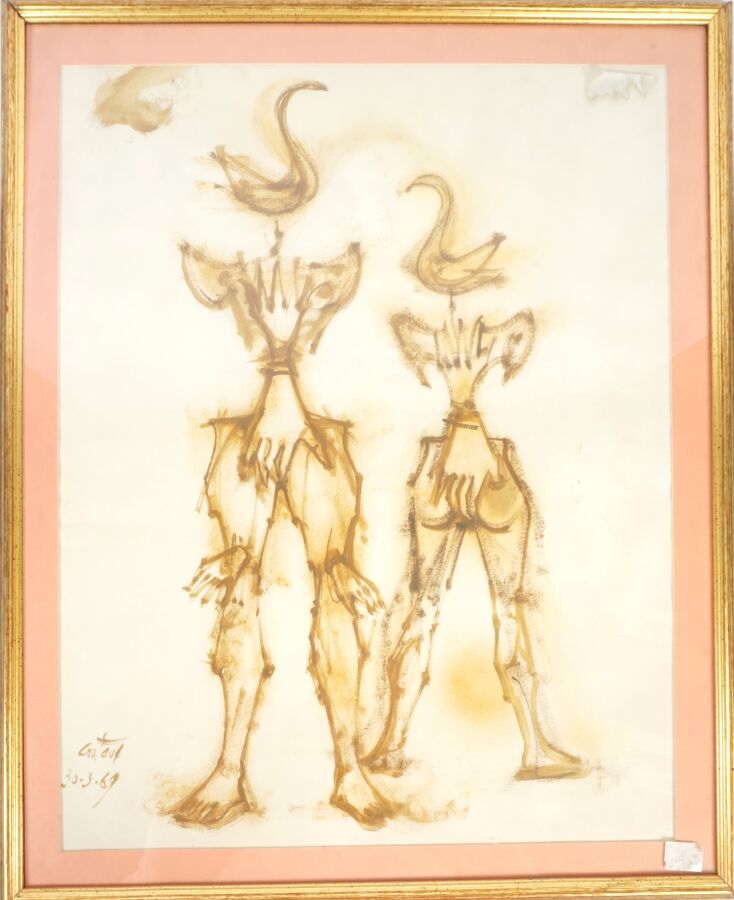 Lucien COUTAUD (1904-1977), "Personnages surréalistes" 30.3.68, gouache et lavis sur papier, signée et datée en bas à gauche dans la planche, 45 x 35 cm (à vue).