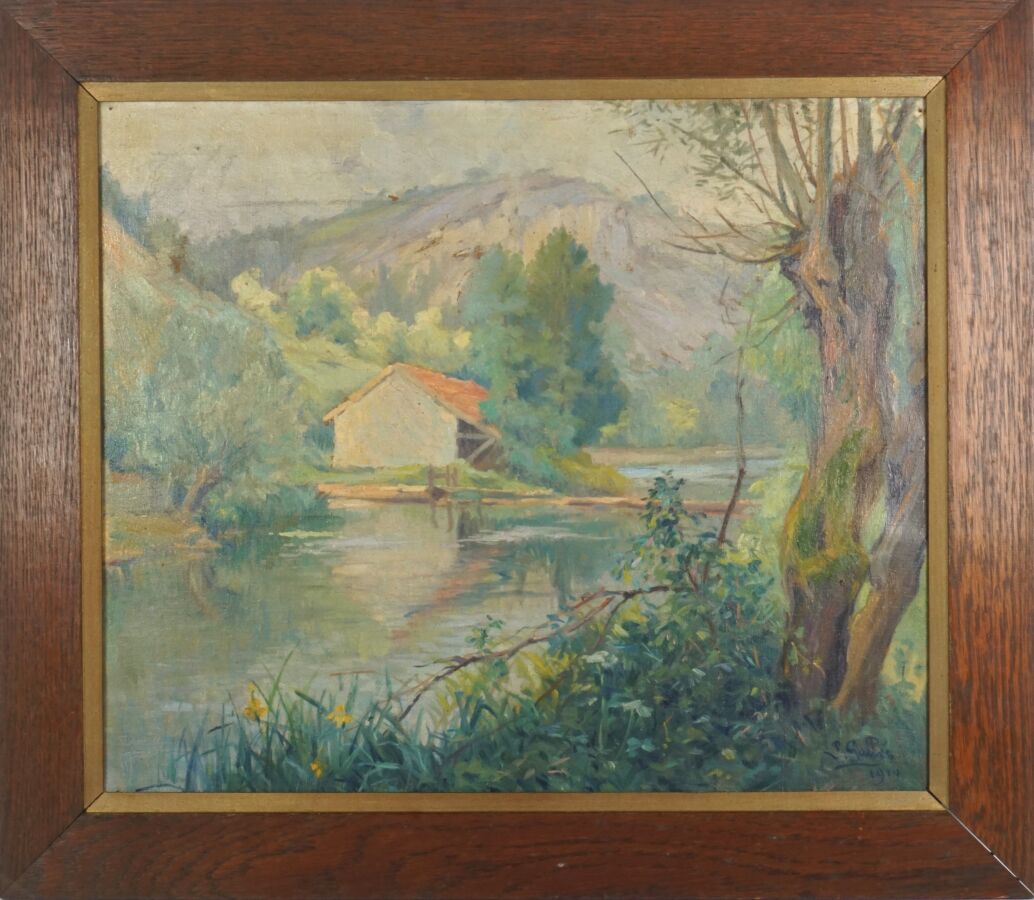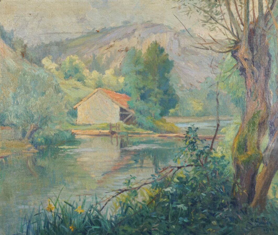 Lucien GALLÉE (XIX-XXe), "Paysage à l'étang", huile sur toile signée et datée en bas à droite, 45 x 53 cm.