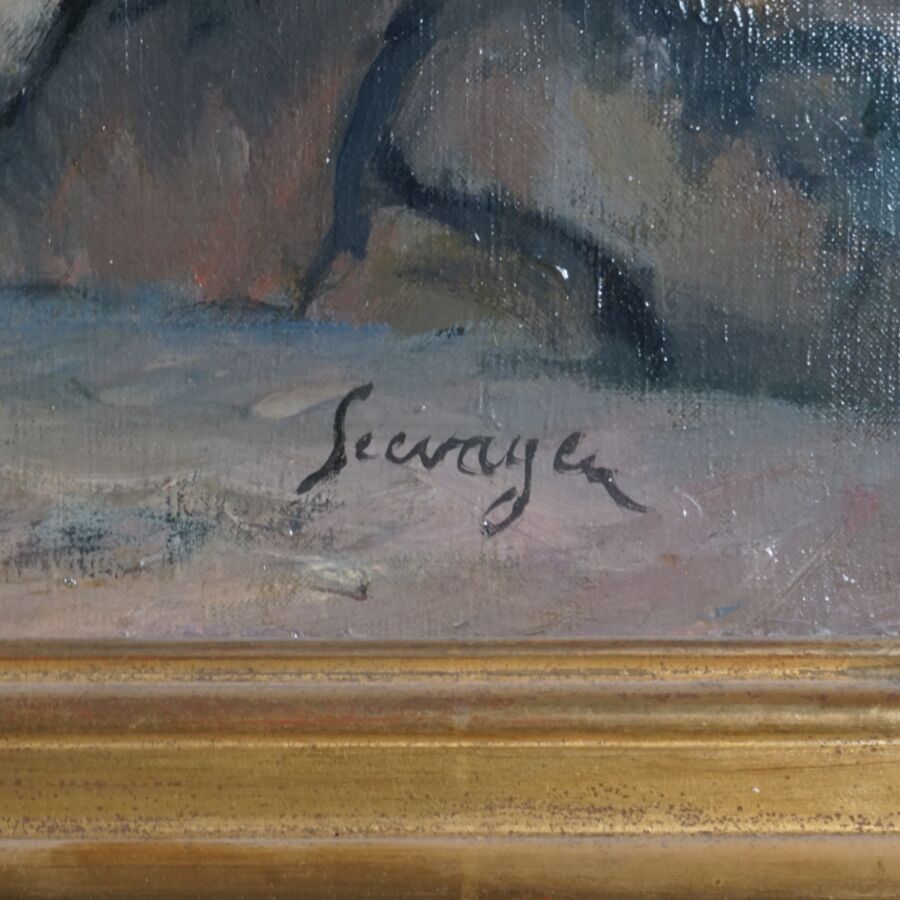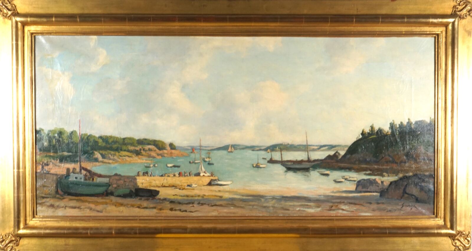 Lucien SEEVAGEN (1887-1959), "Bréat, le port", huile sur toile signée en bas à droite, Dim. 56.5 x 123.5 cm.