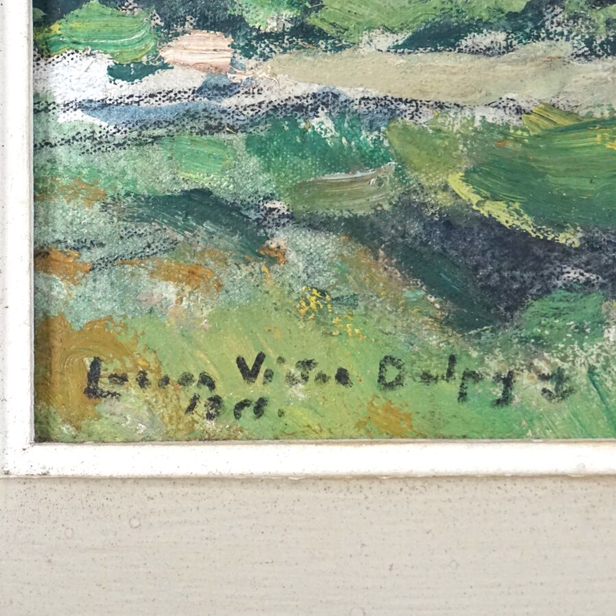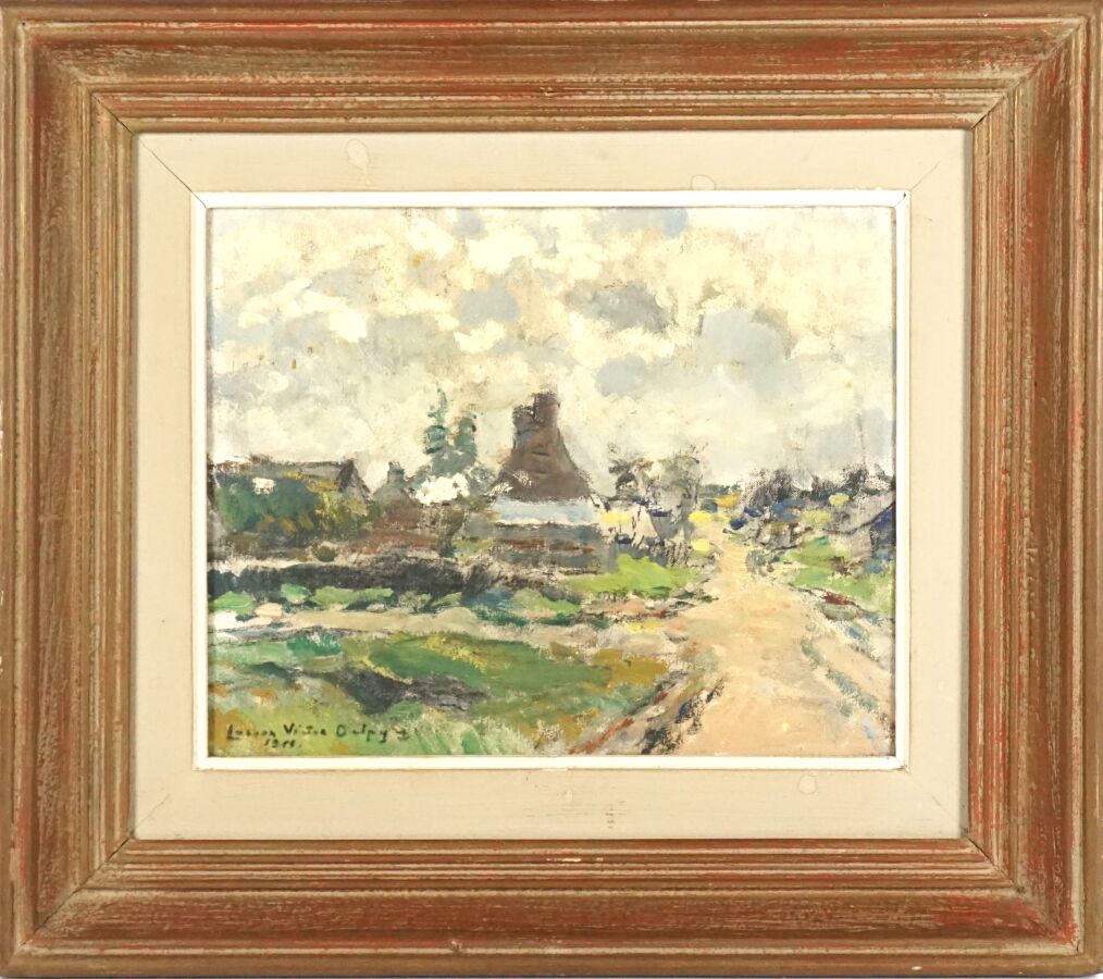 Lucien Victor Félix DELPY (1898-1967), "Route de campagne dans le Morbihan" circa 1952, huile sur panneau, signée à l'ancre de marine et datée en bas à gauche, 22.4 x 27.4 cm.