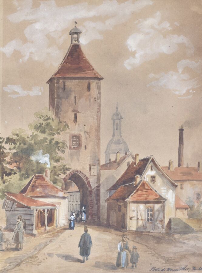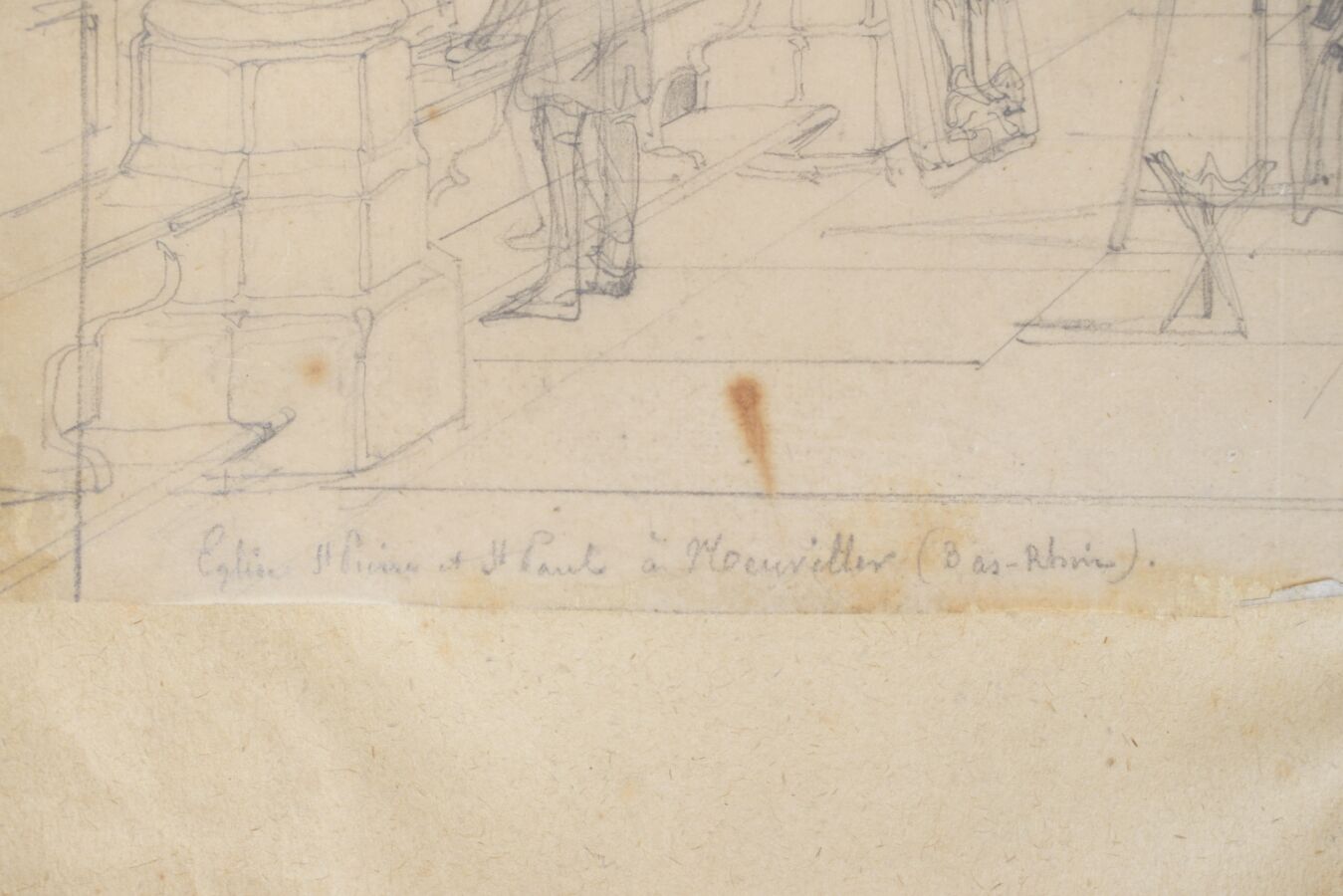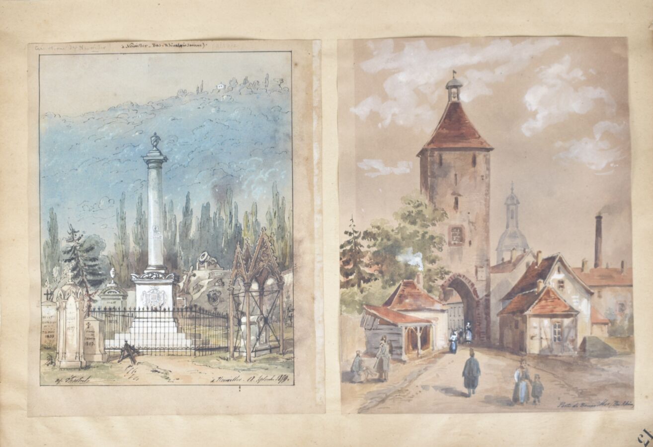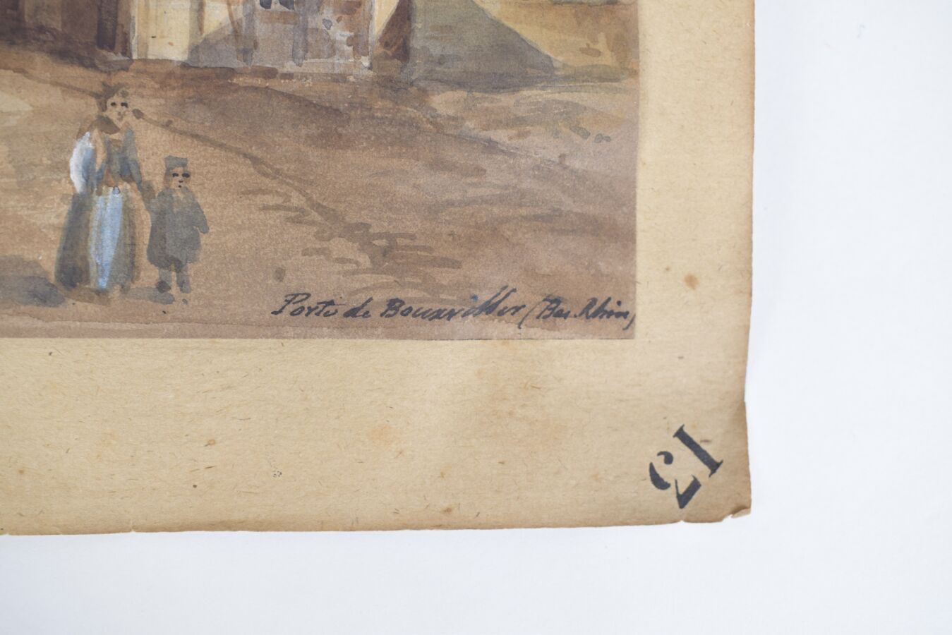 Ludovic d'HASTREL (19e siècle), "Eglise St Pierre...à Neuwiller (Bas-Rhin) " 25 février 1891, dessin sur papier calque au crayon daté en bas à droite, 30 x 21.5 cm ; "à Neuwiller Bas-Rhin (après Saverne)", dessin à l'aquarelle et encre signé en bas à gauche et daté en bas à droite, 20.5 x 16.5 cm ; "Porte de Bouxvillon" (Bas-Rhin), dessin à l'aquarelle et encre, 20.2 x 20.5 cm.