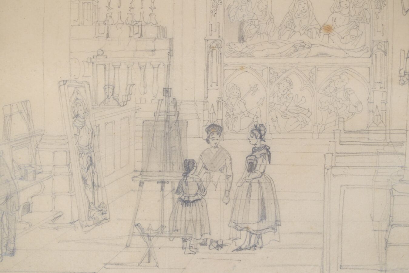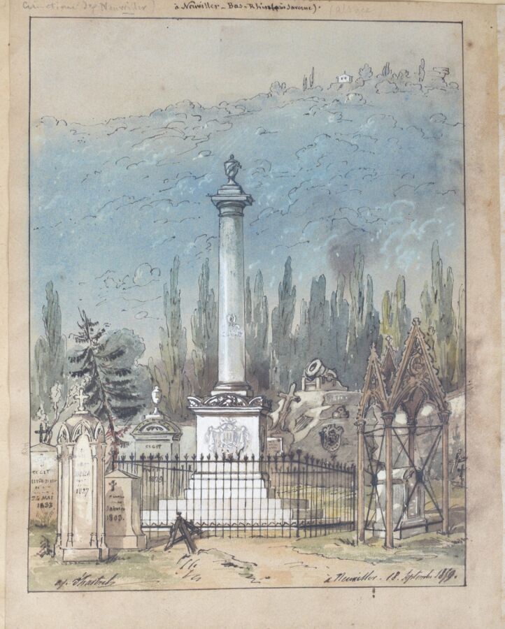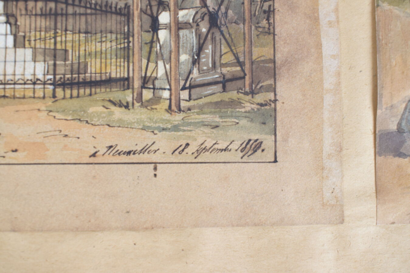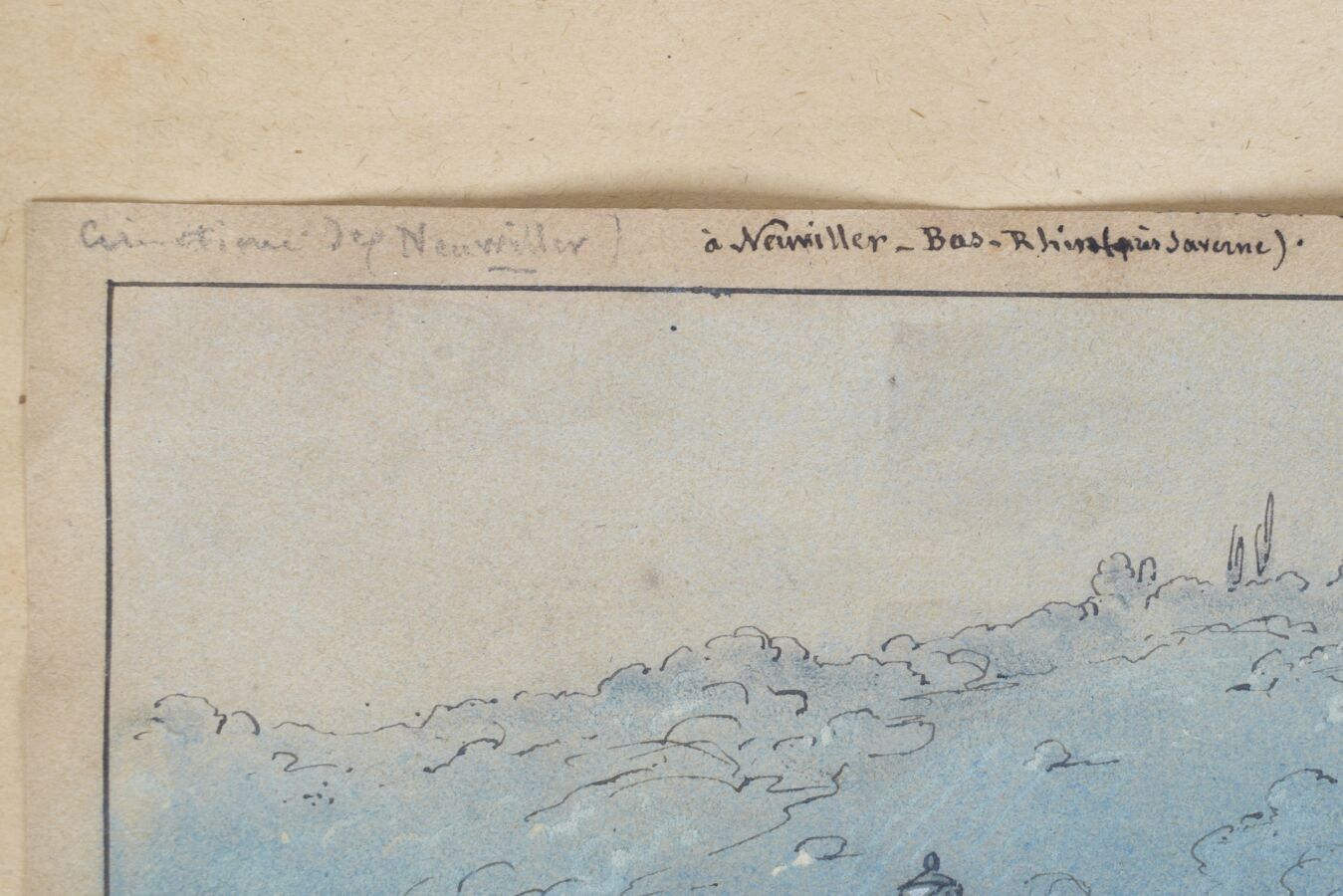 Ludovic d'HASTREL (19e siècle), "Eglise St Pierre...à Neuwiller (Bas-Rhin) " 25 février 1891, dessin sur papier calque au crayon daté en bas à droite, 30 x 21.5 cm ; "à Neuwiller Bas-Rhin (après Saverne)", dessin à l'aquarelle et encre signé en bas à gauche et daté en bas à droite, 20.5 x 16.5 cm ; "Porte de Bouxvillon" (Bas-Rhin), dessin à l'aquarelle et encre, 20.2 x 20.5 cm.