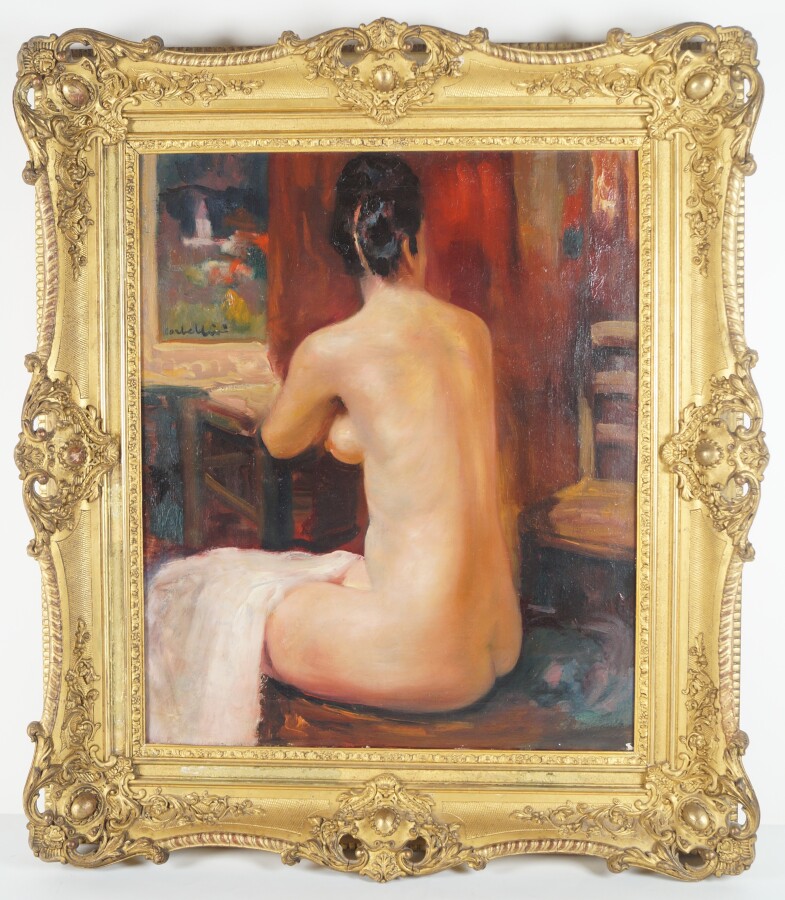 Luigi CORBELLINI (1901-1968), "Nu de femme dans un intérieur", huile sur toile signée en haut à gauche, 54 x 45 cm. (petits manques dans le bas de la toile)