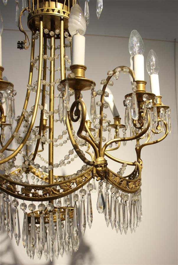 Lustre style Directoire à 12 bras de lumière, bronze doré et ciselé, à décor de visages d'égyptiennes, de pampres de vigne et de croisillons, H. 90 cm