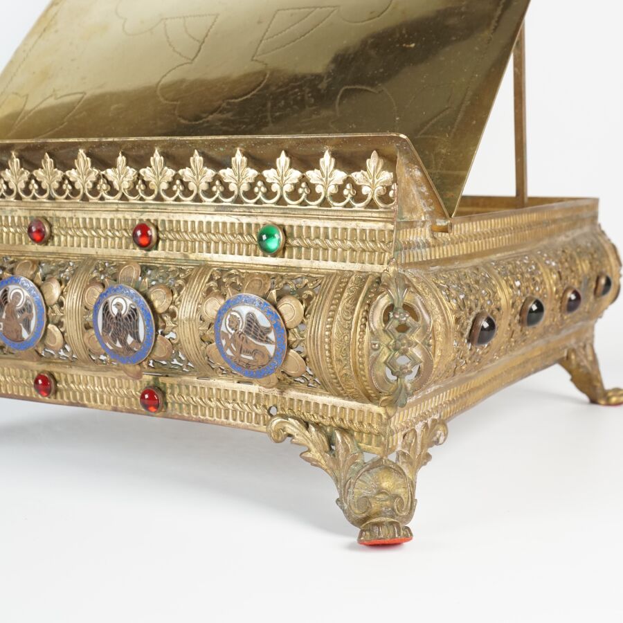 Lutrin d'autel en cuivre et laiton ajouré, le plateau relevable à décor d'une croix, le piètement ajouré orné sur une face de cabochons de verroterie à l'imitation de la pierre précieuse et orné de quatre médaillons émaillés à motif des quatre évangélistes, fin du 19ème siècle, Dim. 32 x 27 x 15 cm (petites usures).