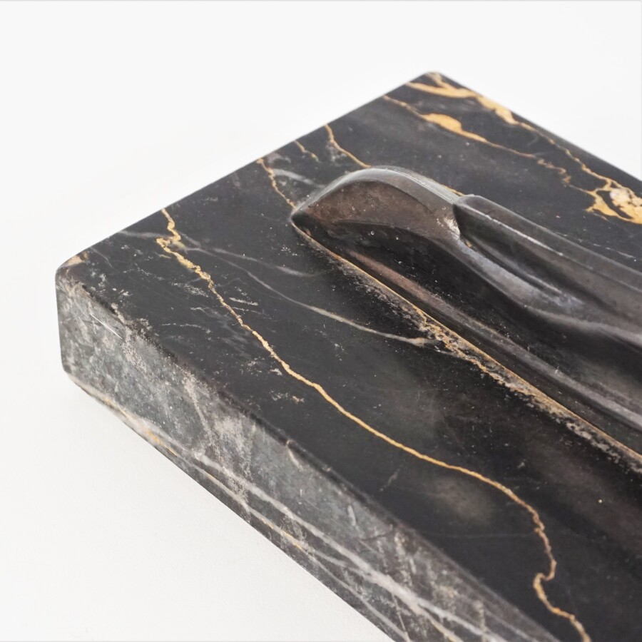 M. FONT (XXe), "Poissons", feuille de plomb, signée en creux sur la terrasse, reposant sur un socle rectangulaire en placage de marbre Portor, H. Totale : 28 cm, L. 32 cm.