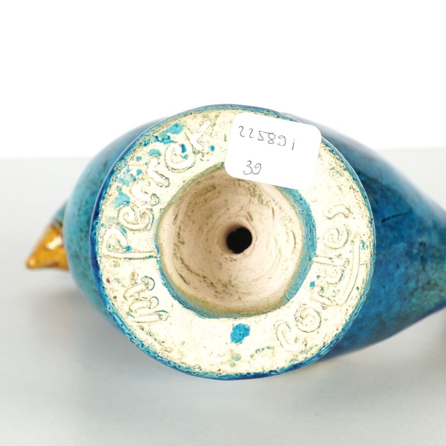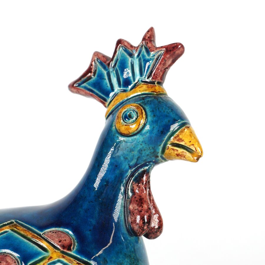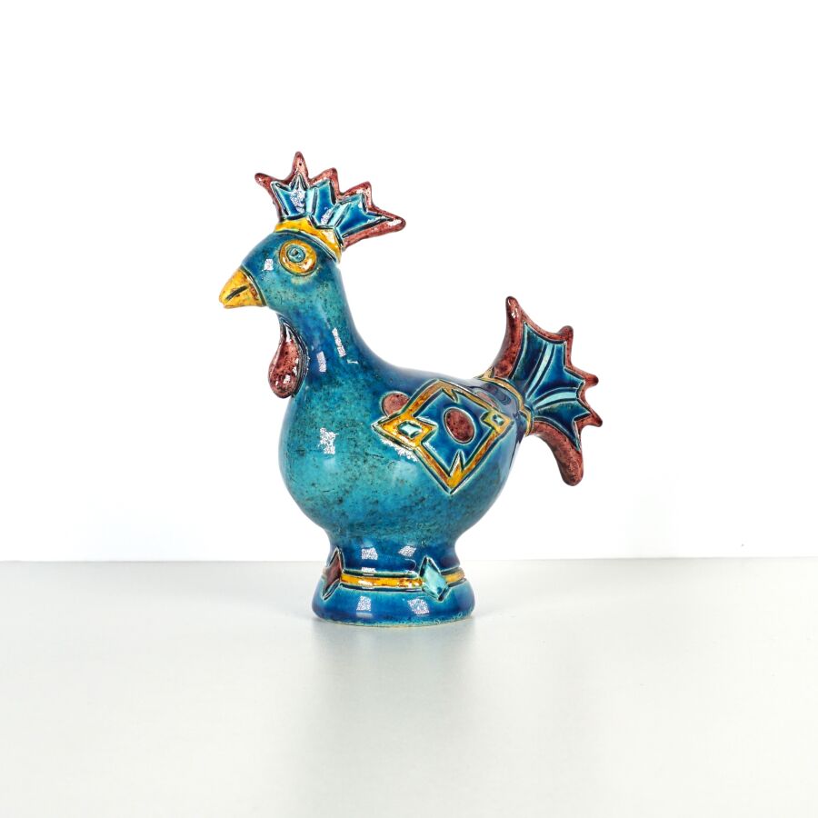 M. PERRET - CORDES : " Coq ", sujet en faïence émaillée polychrome, signé dessous, H. 19.5 cm.