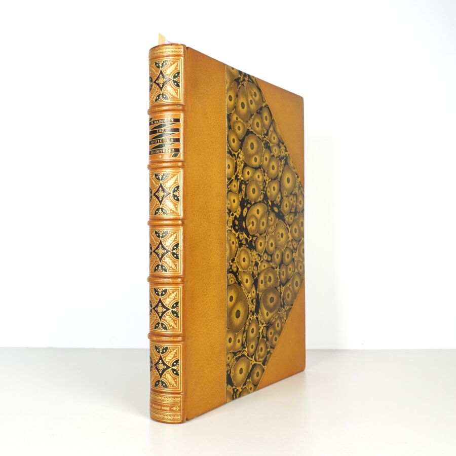 MAINDRON (Ernest). Les Affiches Illustrées. Paris, Launette & Cie, 1886. In-4 de x, 160 pp. demi-maroquin blond à coins, dos à nerfs richement orné d'un décor doré et mosaïqué avec titre en lettres dorées dans un ruban de maroquin noir, lieu et date en queue, filet doré sur les plats, tête dorée, deux couvertures et dos (couleurs et bistre) conservées (David).
