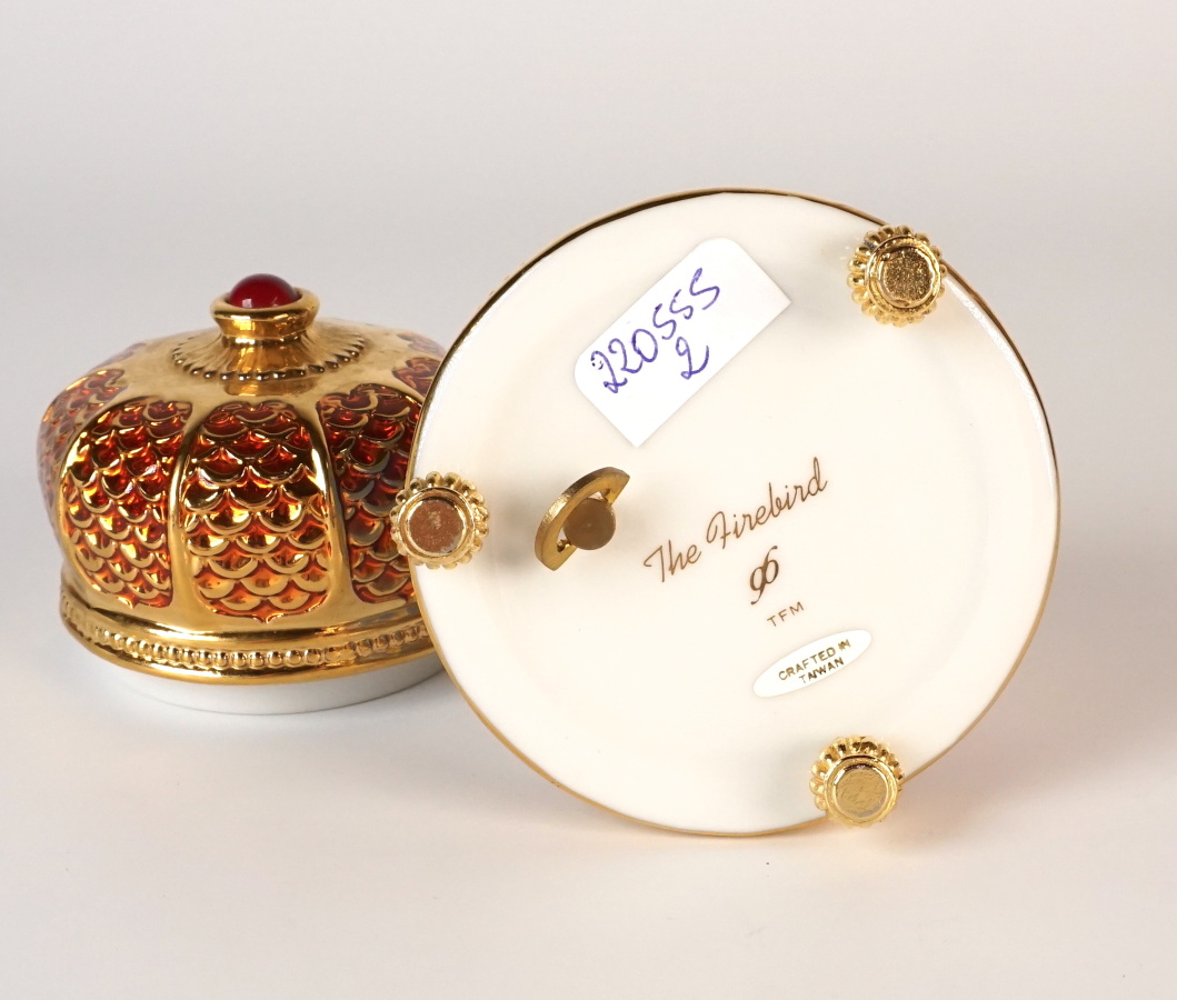Maison FABERGE & TFM : Boîte à musique circulaire "The Firebird", formant boîte à bijoux, en porcelaine rehaussée à l'or, à décor illustrant le conte russe de l'Oiseau de feu retenu par le prince Ivan, collection "The Imperial Music Box", H. 8.5 cm, D. 7 cm (parfait état).