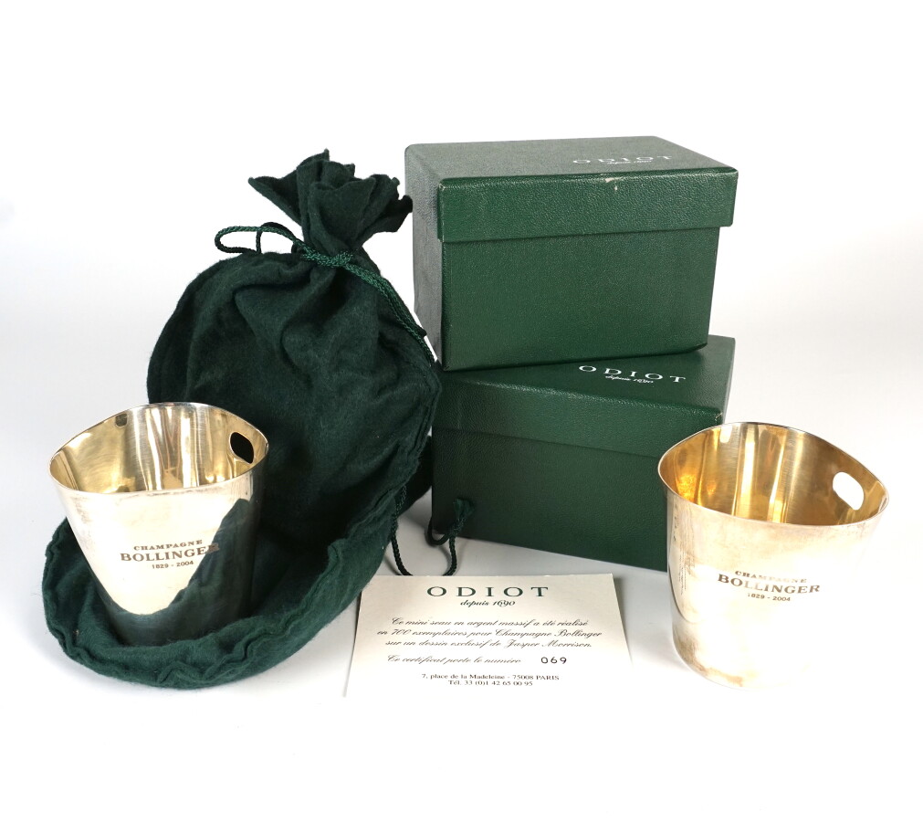 Maison ODIOT : Ensemble de 2 mini seaux à Champagne en argent massif, poinçon Minerve, dessin exclusif par Jasper Morrisson pour le Champagne Bollinger, édités à 700 exemplaires. Poids brut : 77.6 g + 74.5 g environ. Présentés chacun dans leur coffret, l'un avec certificat.