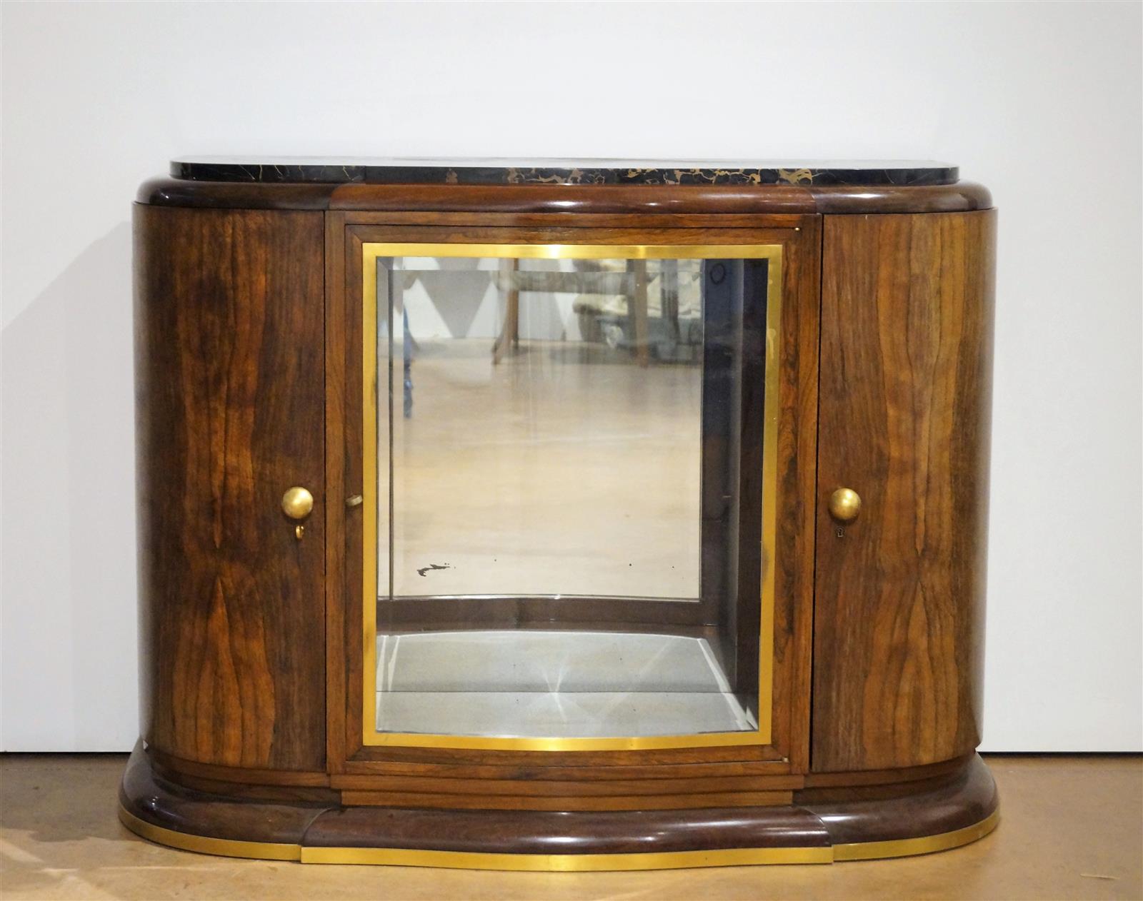 Maison PIGEON : Argentier en noyer et placage de noyer, la façade à léger ressaut, il ouvre par une porte vitrée au centre découvrant une niche à fond de glace, deux portes en encoignures, plateau de marbre portor, 49 x 137 x 105 cm (avec deux clés, quelques rayures et manques, poignées à refixer)