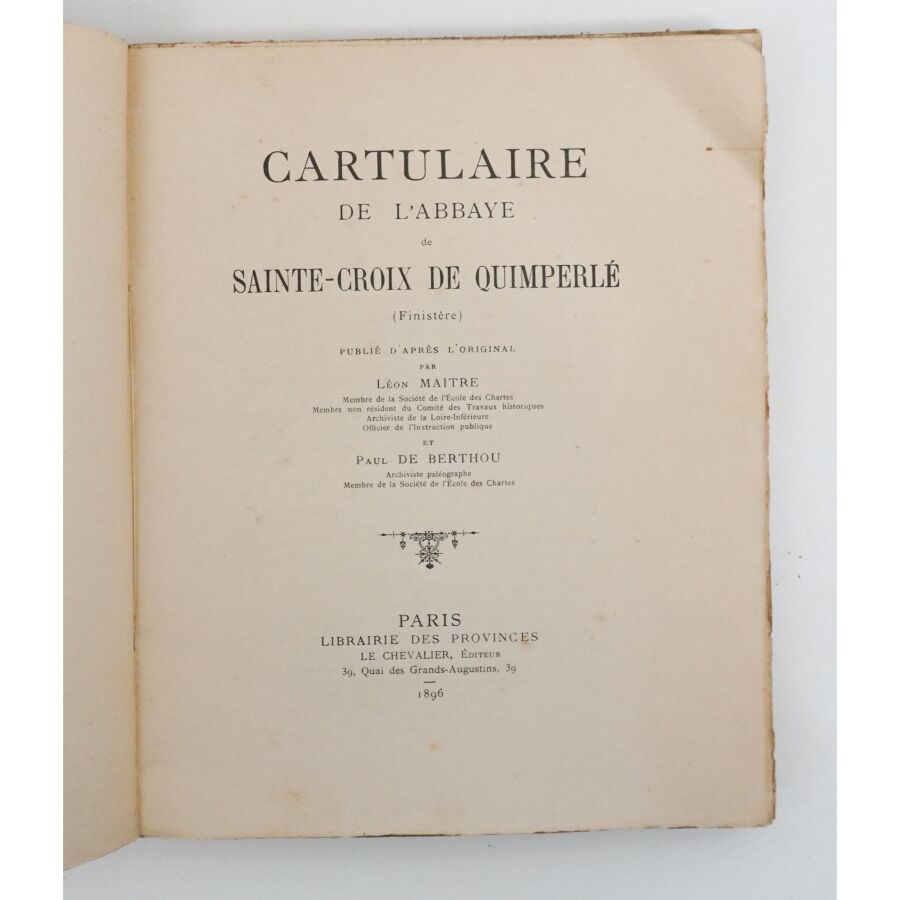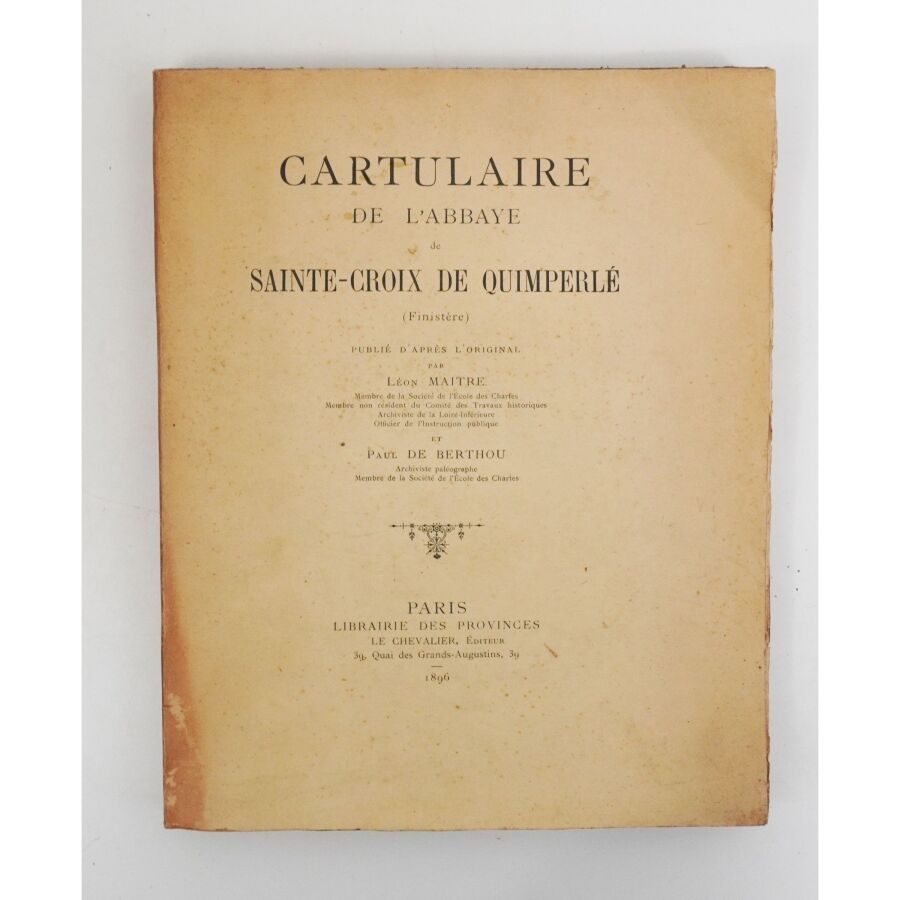 MAITRE (Léon) & BERTHOU (Paul de). Cartulaire de l'abbaye de Sainte-Croix de Quimperlé. Paris, Le Chevalier, 1896. In-4, broché, couv. imprimée (dos bruni).