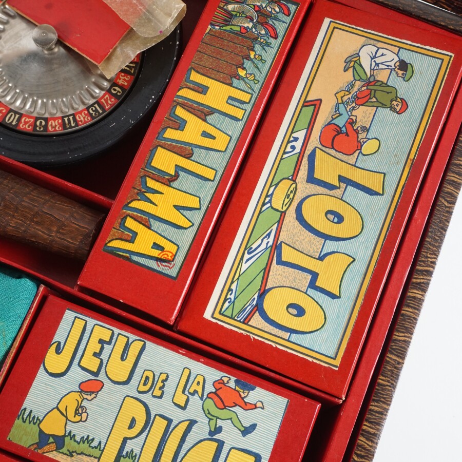 Malle de jeux comprenant divers jeux de plateaux dont Bingo, Loto, Jeu de la Puce, Roulette etc., complète de ses jeux (petites usures).