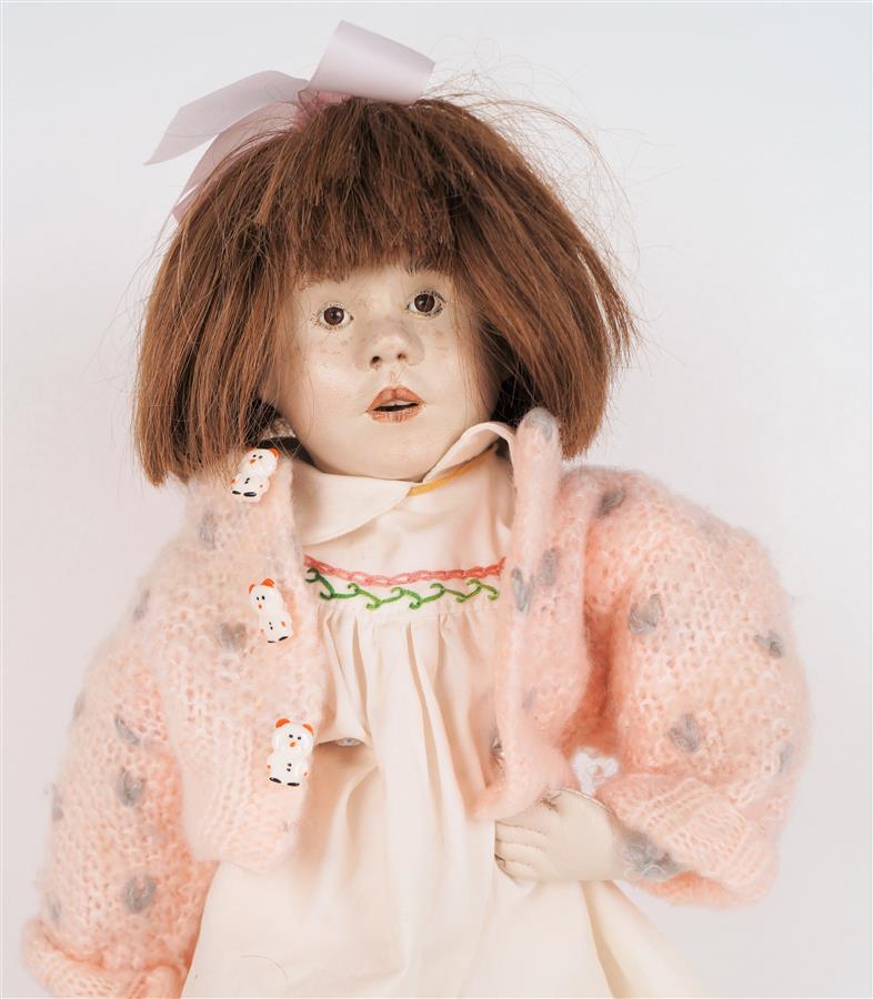 MALOU ANCELIN : Jolie poupée en cuir, 1970, avec habits et perruque, H. 40 cm.