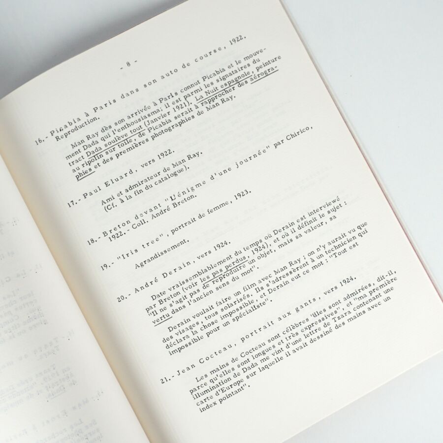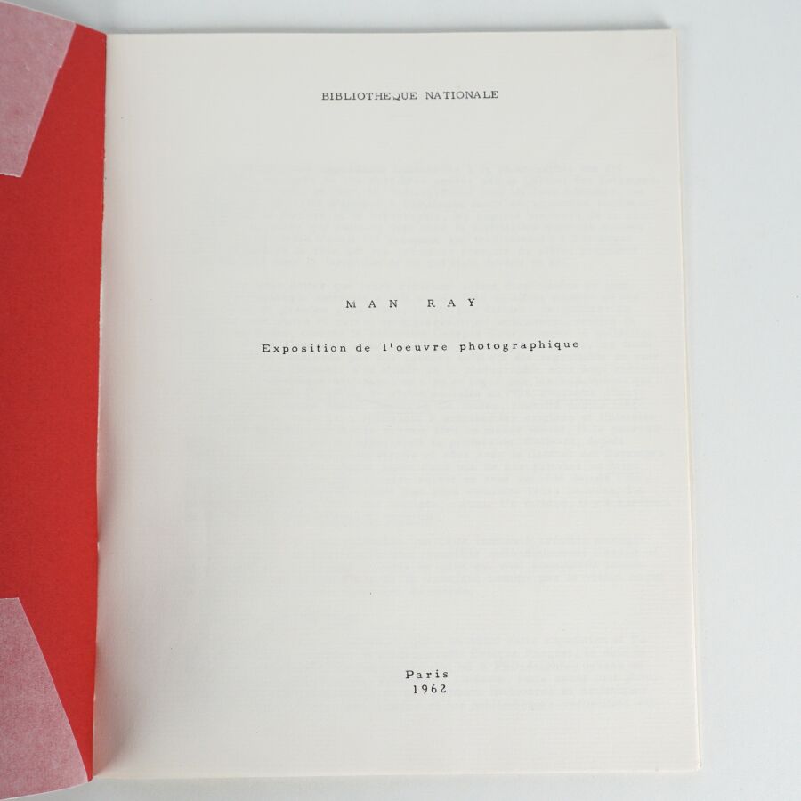 MAN RAY. Catalogue de l'exposition Man Ray, l'oeuvre photographique. Paris, Bibliothèque nationale, 1962. In-4 broché de 16 ff. ronéotypés, couv. rouge imprimée en blanc et ornée d'une photographie contrecollée.