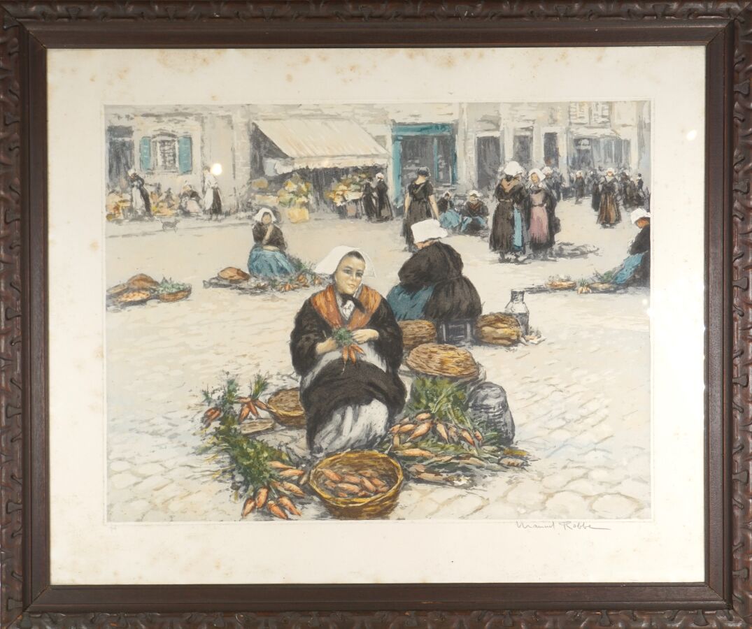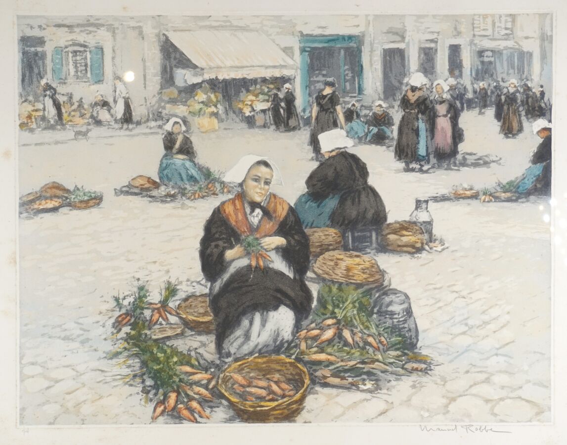 Manuel ROBBE (1872-1936), "Marché en pays vannetais", eau-forte et aquatinte signée dans la marge en bas à droite et numérotée 70 en bas à gauche, 45 x 59 cm (rousseurs).