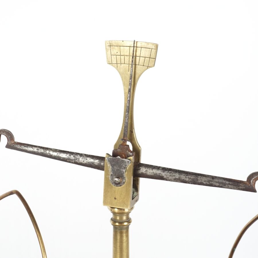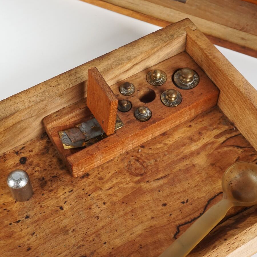 MANUFACTURE FRANCAISE SAINT-ETIENNE - ARMES ET CYCLES : Balance trébuchet en laiton, présenté sur support rectangulaire en bois ouvrant à un tiroir, accompagné de ses poids (incomplet) (usures).