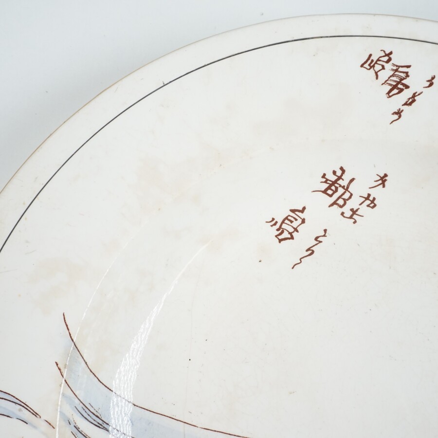 MANUFACTURE VIEILLARD - BORDEAUX : Partie de service de 79 pièces, modèle "Japon", faïence émaillée polychrome et rehauts d'or à décor japonisant de volatiles, insectes et poisson comprenant 26 assiettes plates (1 fêle à l'une, infime éclat au bord d'une autre), 20 assiettes creuses (deux non rehaussées à l'or, infime éclat à l'une), 21 assiettes à dessert (petit fêle et éclat sur une assiette), 1 plat rond, 2 plats ovales (le plus grand restauré et agrafé), 1 saucière (cassée), 2 raviers (écaillures et usures à l'émail de l'un), 1 coupe tripode piètement figurant des éléphants (coulure d'émail légère sur le côté), 2 coupes sur pieds (éclat à un pied, coulure d'émail), 1 compotier couvert tripode avec son couvercle, la prise figurant un lézard (petit éclat sur la prise) et 2 légumiers dont un tripode, les prises à motifs d'un couple de chiens de Fo (éclat au couvercle de l'une, éclat à la prise de l'autre et restauration), marqués dessous du cachet japonisant (quelques usures à l'or et à l'émail, petites taches sur certaines pièces).