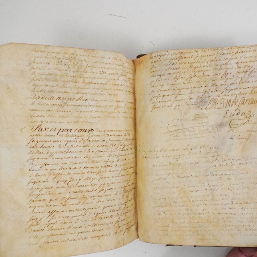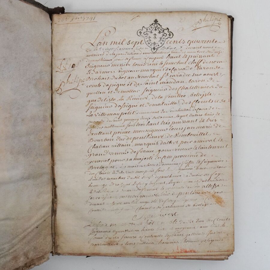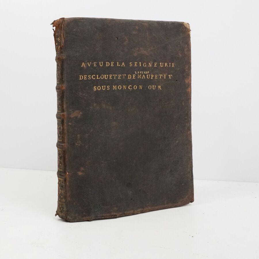 Manuscrit du XVIIIe siècle. Aveu de la seigneurie des Clouets et de la ville Maupetit sous Moncontour par Louis René le Sénéchal, Marquis de Carcado, le 26 octobre 1741. In-4 de 92 pp. manuscrites sur parchemin, veau brun, dos orné, titre doré sur le premier plat (reliure de l'époque).