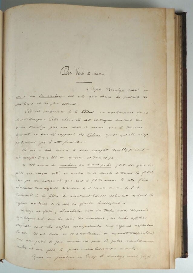 [MANUSCRIT] - ÉCOLE SUPÉRIEURE DE LYON - Cours de tissage - 1 fort volume In-folio (39,40x27,50 cm) manuscrit d'environ 500 pages avec titre imprimé - Vers 1910-1920 - Nombreux schémas de tissages en noir, rouge et vert, de très nombreux échantillons de tissus maintenus par des encoches de soie, quelques patrons - Environ 500 pages, de celles-ci 14 pages imprimées : Description de la mécanique Jacquard avec 3 grandes figures gravées hors texte - Description de la mécanique Verdol avec 3 grandes figures gravées hors texte - Esquisse-Mise en carte - Description du lisage accéléré (Système Verdol) avec 2 grands schémas manuscrits et 1 planche hors texte Cartons des différents comptes de mécaniques - Description des différentes opérations nécessaires pour le montage d'un métier pour étoffes façonnées) - Belle écriture bien lisible à l'encre noire - Reliure de l'époque demi-chagrin bordeaux à coins (petite épidermure en bas du 1er mors) - Dos à nerfs orné et titré or (Théorie du tissage), avec nom (de l'auteur ?) en queue : Brosset-Heckel - Très bon exemplaire auquel on joint d'autres échantillons de tissu volants.