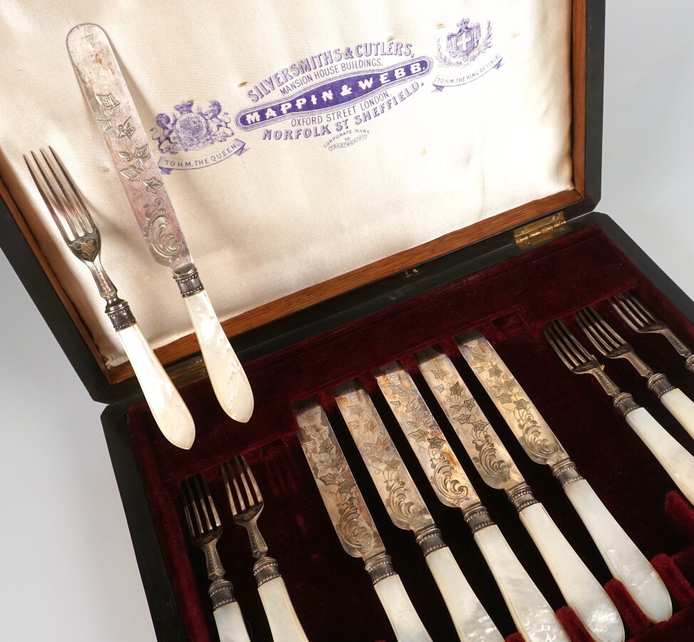 MAPPIN & WEBB London : Suite de 6 couverts à fruits, fourchettes et couteaux, les manches en nacre, les lames et fourchettons en argent anglais (800/oo) à décor ciselé de feuilles de vigne, les virole perlées, L. 14 et 18 cm. Poids brut : 338 g environ.