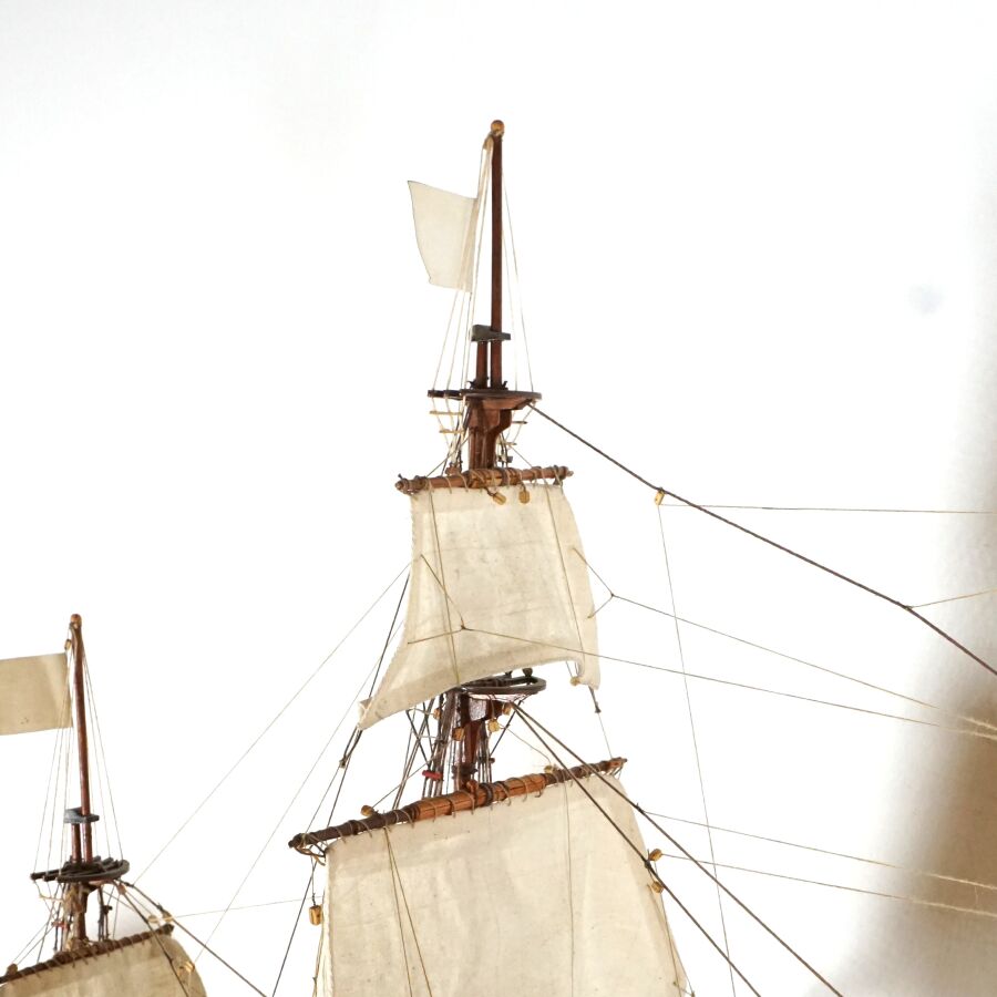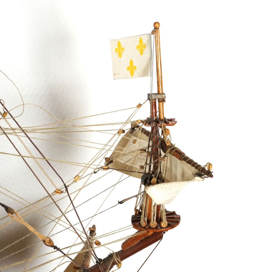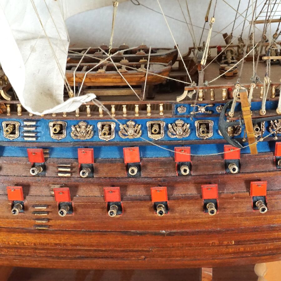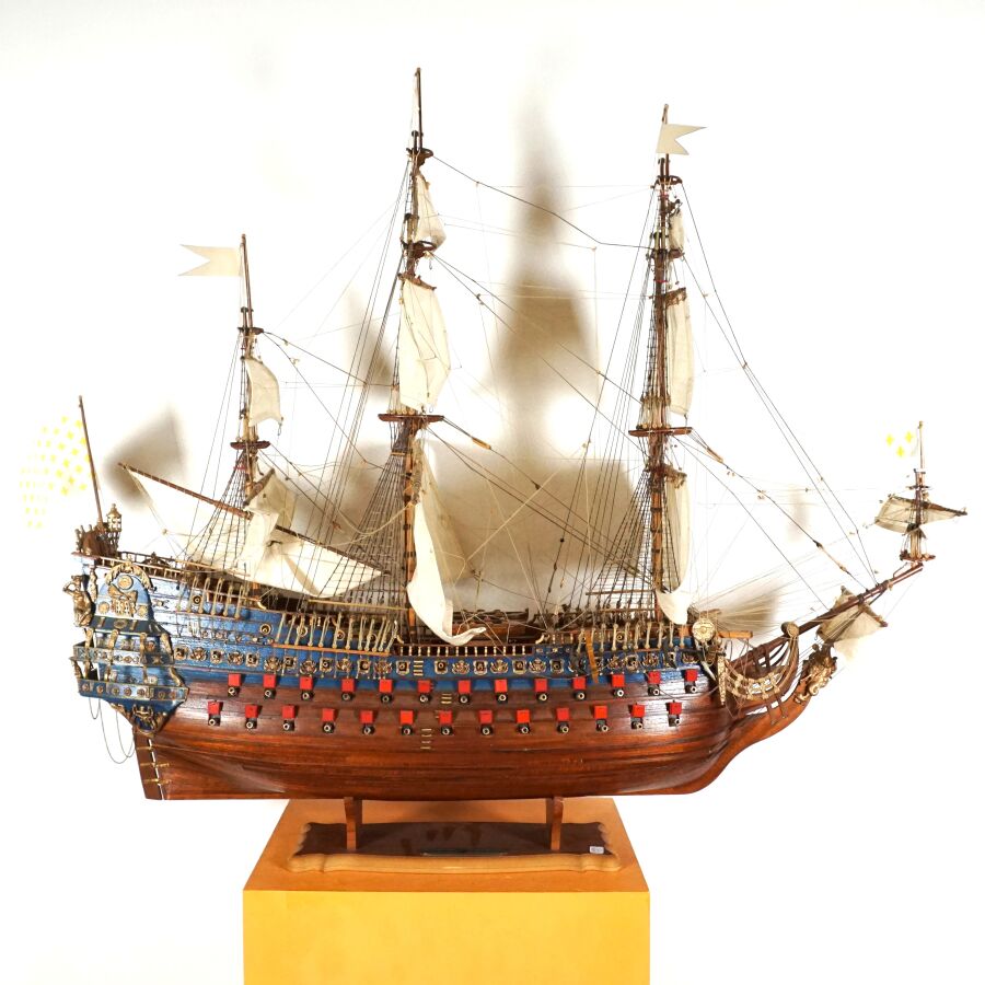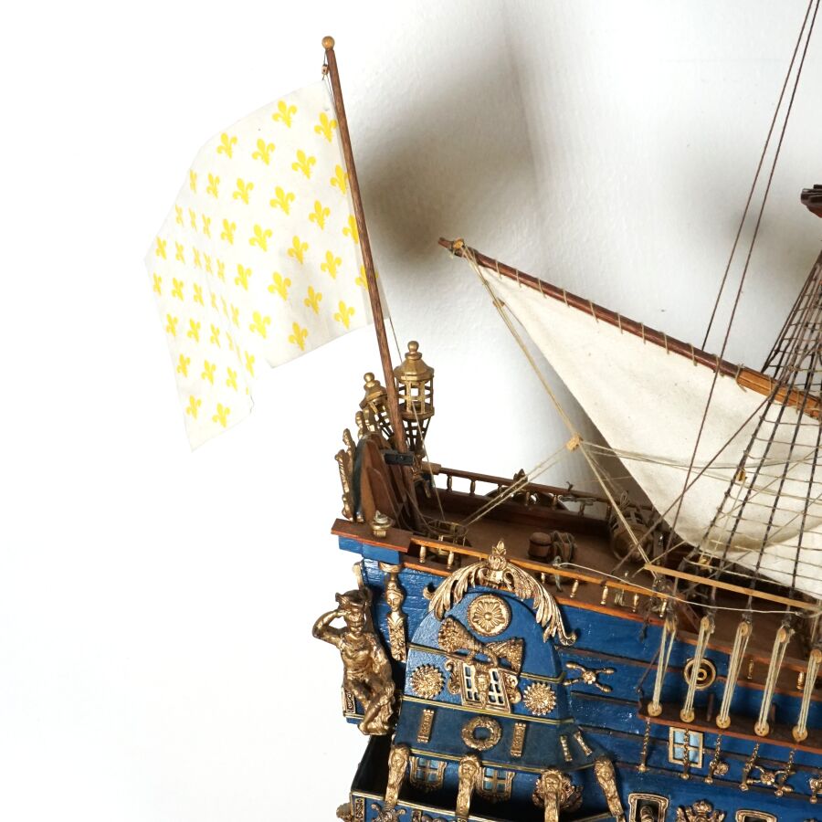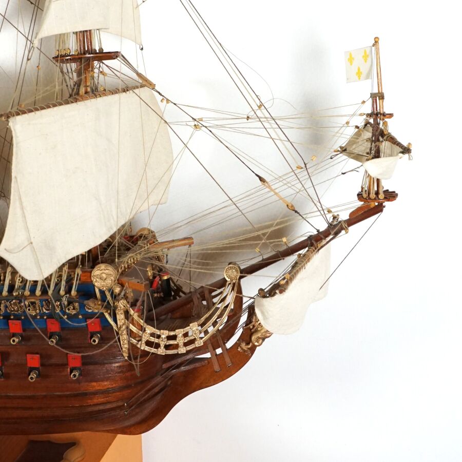 Maquette du bateau "Soleil Royal", représentant un trois-mâts en bois polychrome, tissu et cordages, 20ème siècle, H. Totale : 94 cm. L. 107 cm.