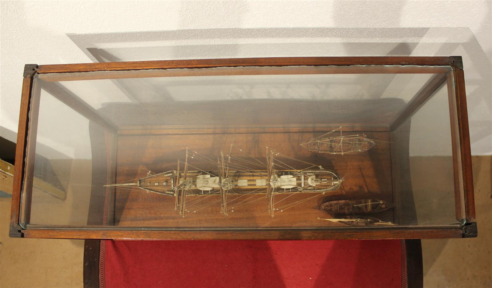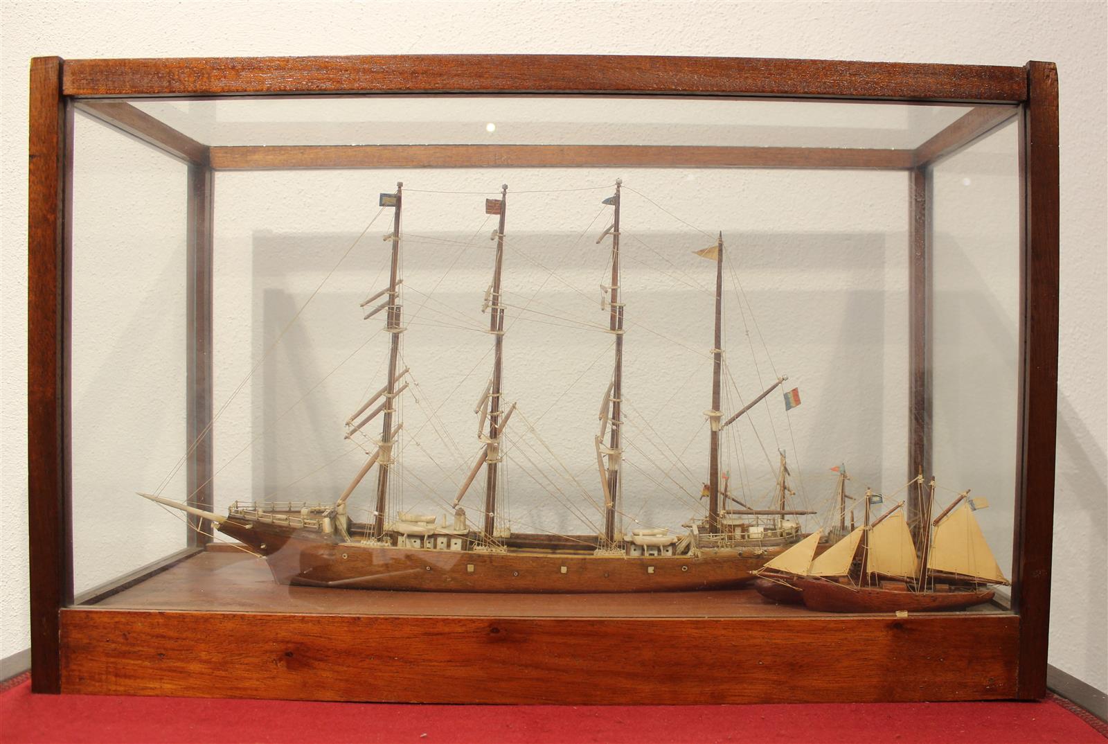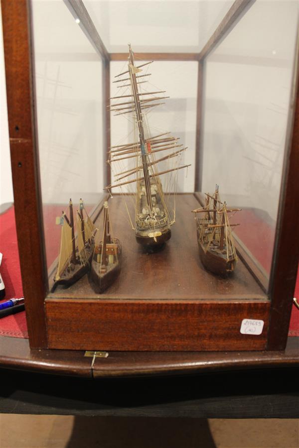 Maquette sous verre représentant un quatre-mâts suivi de deux autres navires, 67 x 27 x H. 41.5 cm