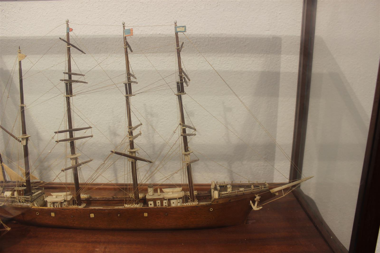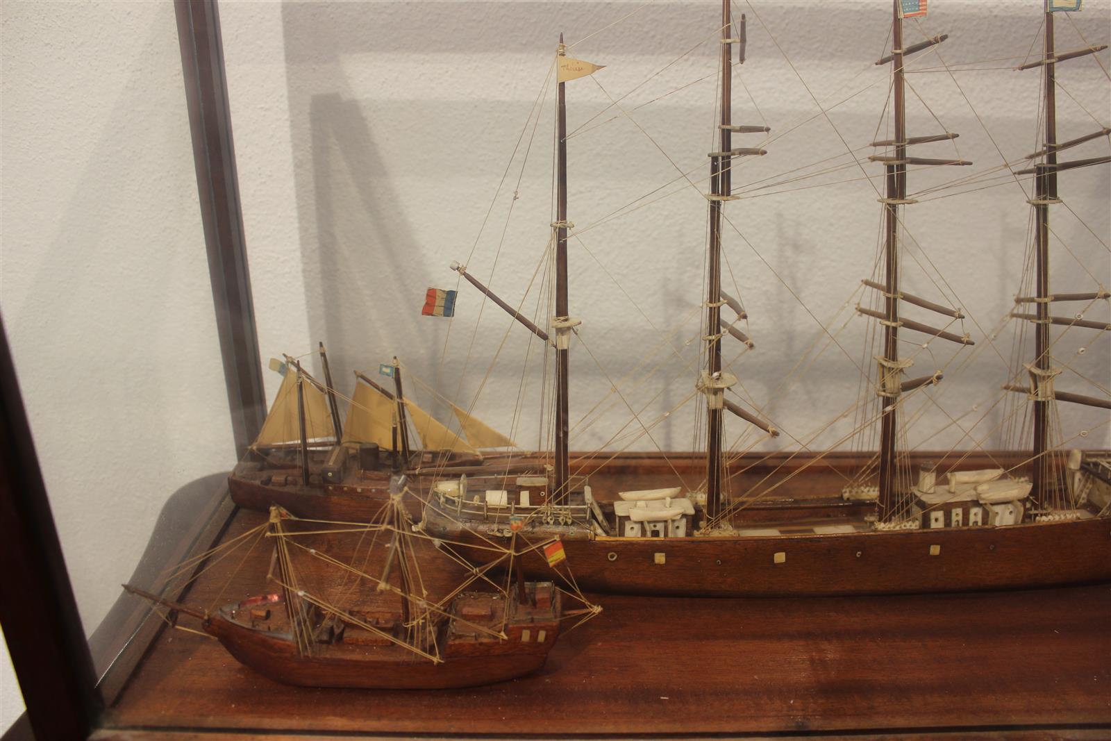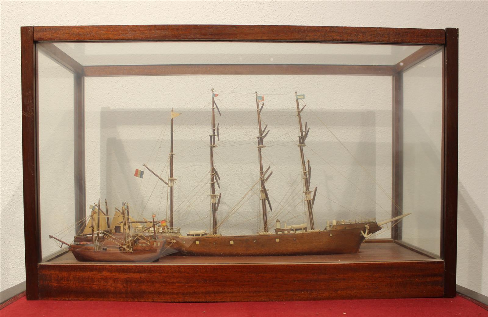Maquette sous verre représentant un quatre-mâts suivi de deux autres navires, 67 x 27 x H. 41.5 cm