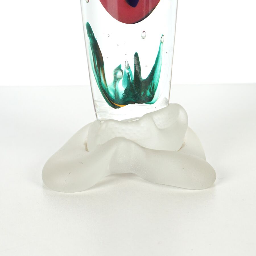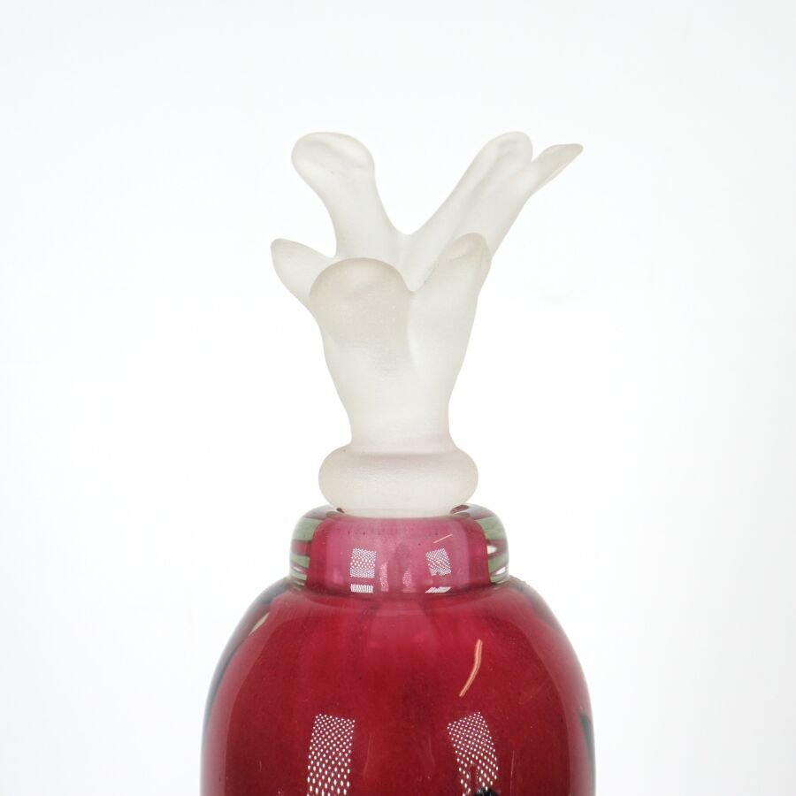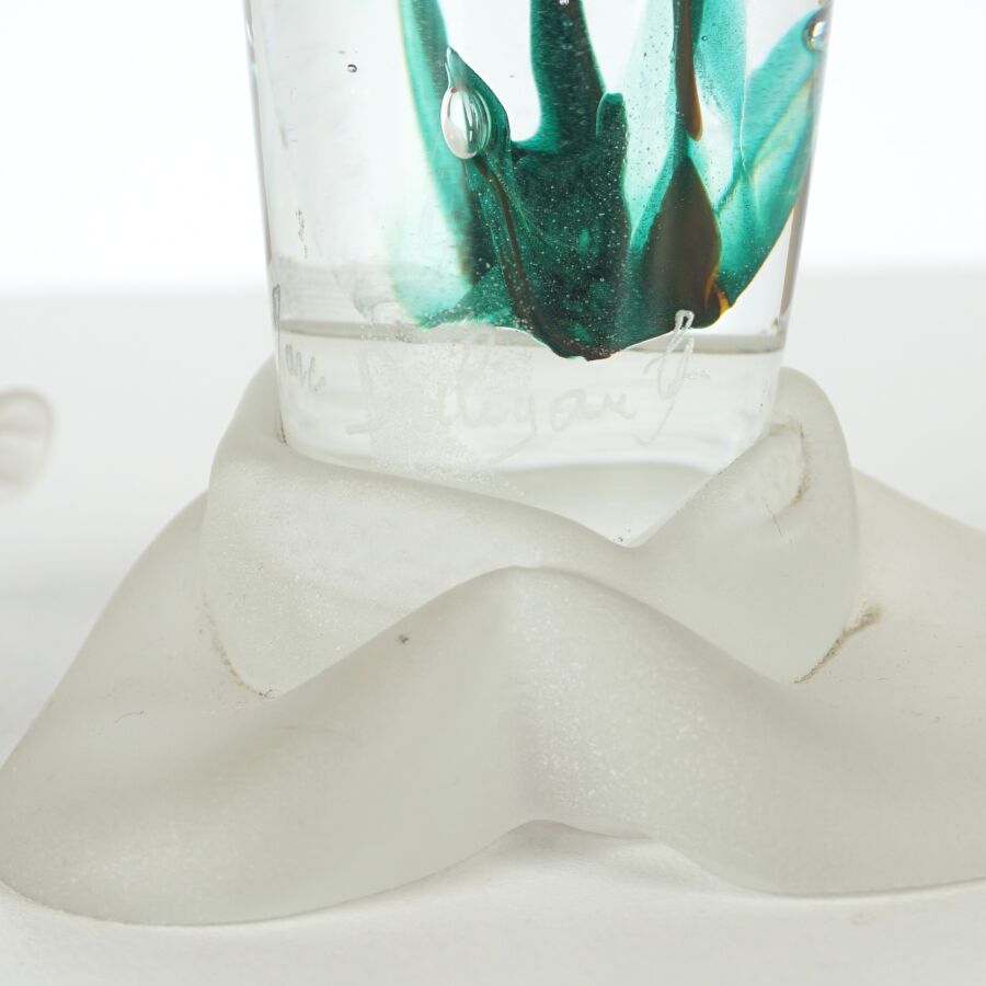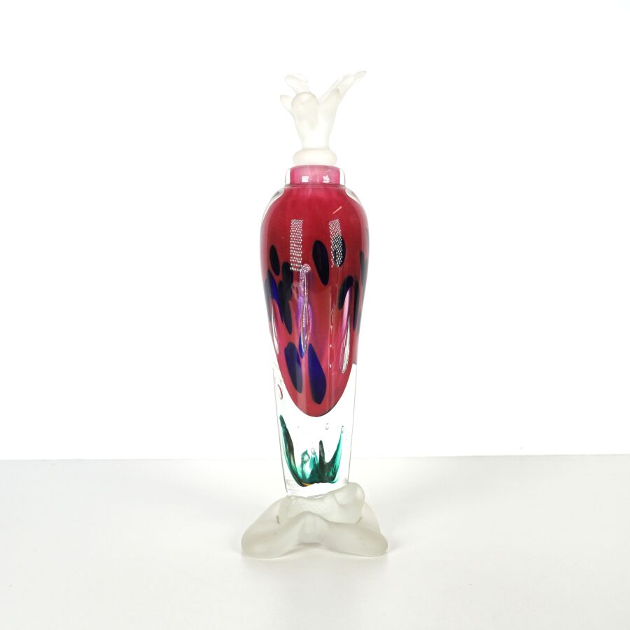 Marc DALIGAULT (XXe), Flacon en verre incolore et inclusions roses, vertes et bleues nuit, piétement tripode organique, avec son bouchon à motif d'une fleur aquatique, signé à la pointe sur le base, H. 31 cm.