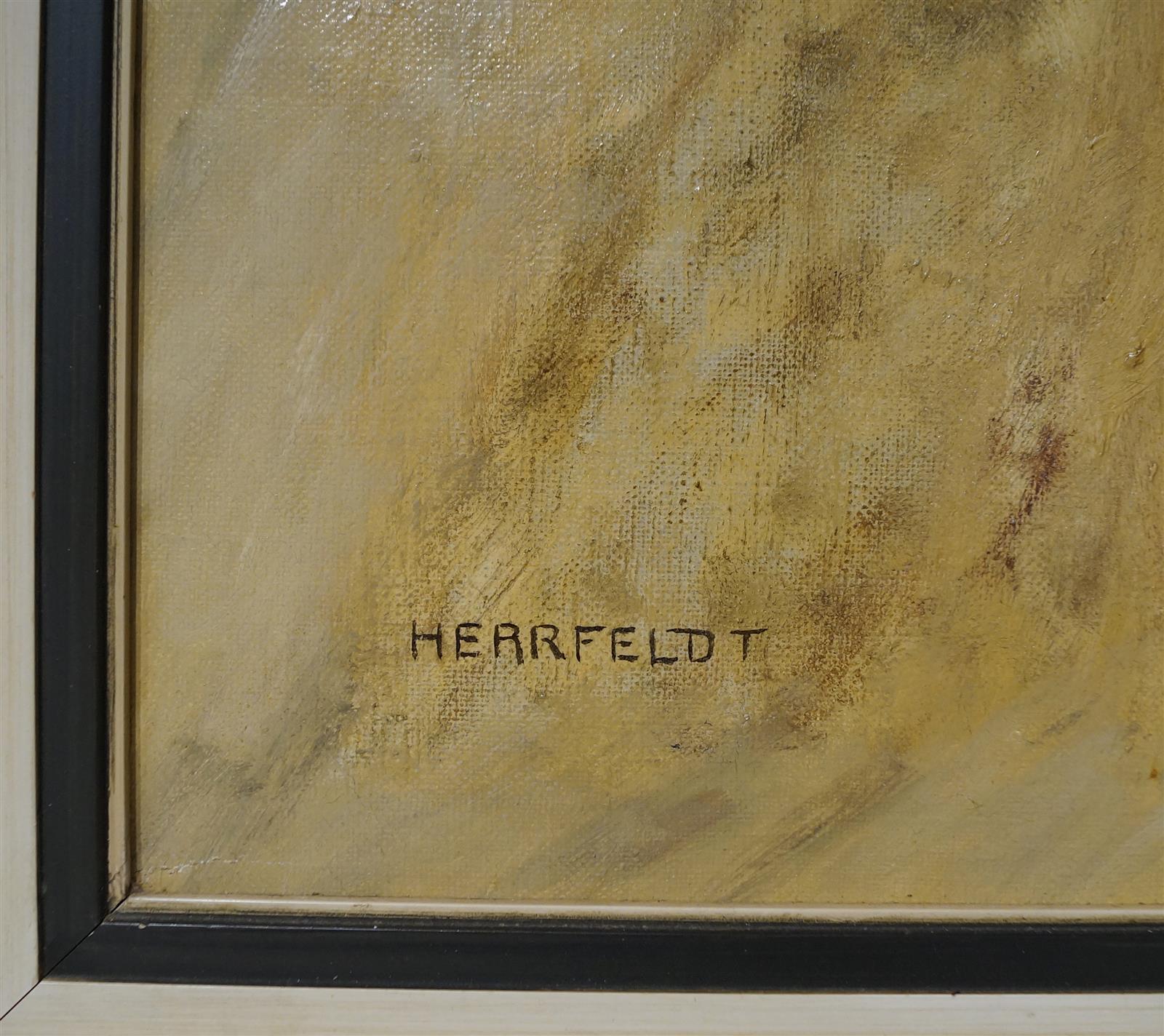 Marcel René HERRFELDT (1889-1965), "Femme méditerranéenne à l'amphore", huile sur toile signée en bas à gauche, 100 x 80 cm (restaurations au niveau du bras gauche, petites craquelure à droite du visage, deux infimes manques près de la main à droite et dans le pagne).