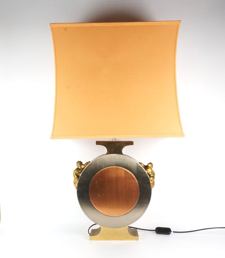 Maria PERGAY (1930-2023), Lampe à poser, modèle "Chimères" réalisé circa 1970, métal argenté, cuivre et laiton, à décor en ronde-bosse de deux chimères, présentée avec son abat-jour d'origine de couleur orangée, H. Totale : 84 cm (oxydations et piqures).
